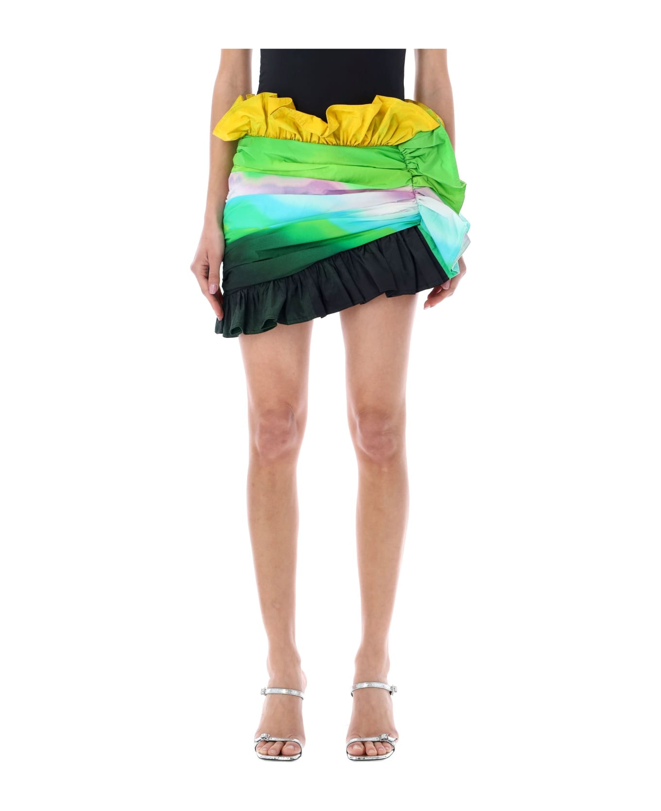 Ombre Nylon Ruffle Mini Skirt By Area. Featuring: Invisible Side Zipper Closure Perimeter With Ruffle Details Curled Effect Lined Model Is 1,72 M Tall And She Is Wearing Size 4
