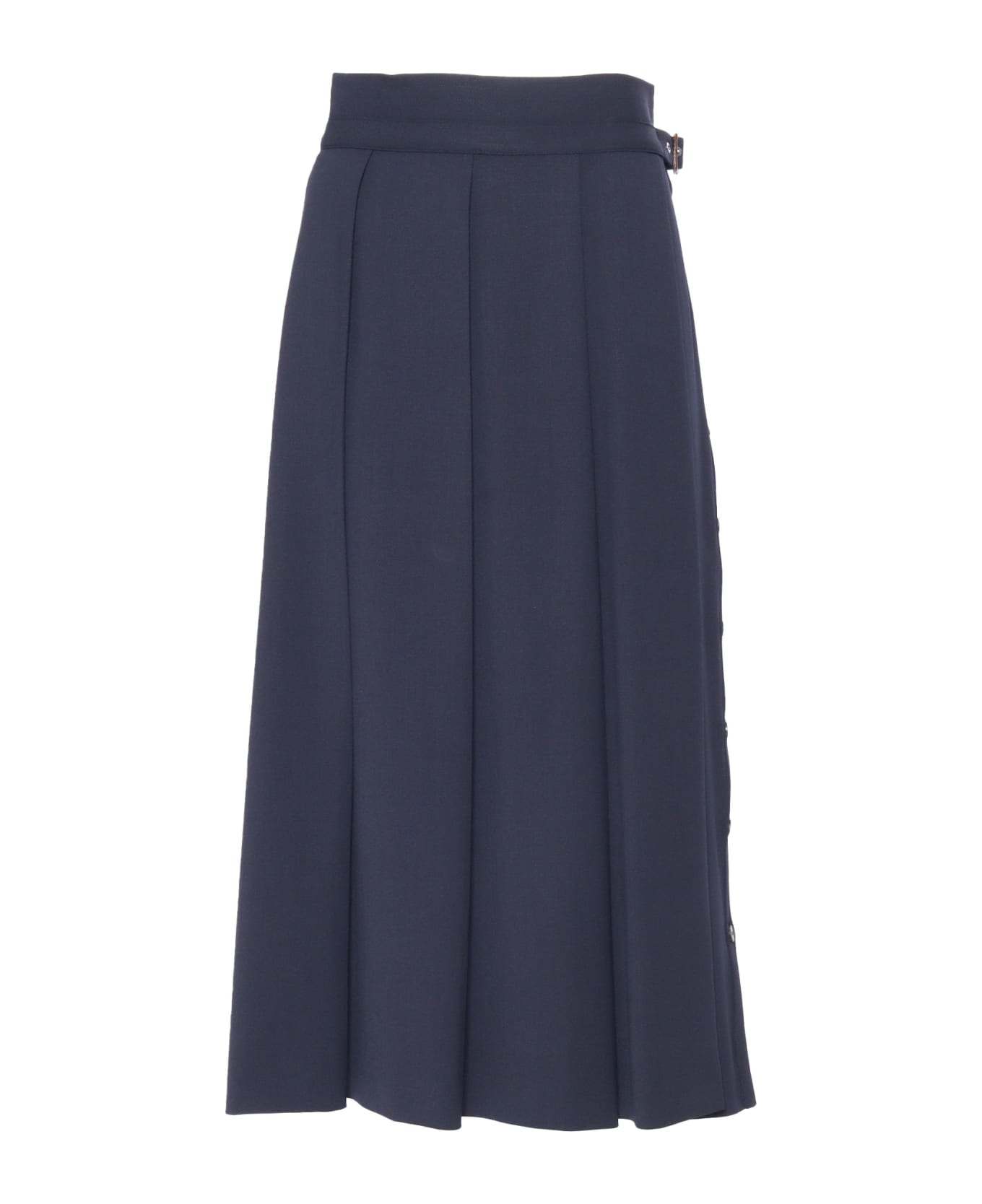 Skirt in technical wool gabardine, stitched belt, belt with buckle at the waist, wide pleats, detail with side buttons, unlined Composition: 53% Polyester 43% Virgin Wool 4% Elastane