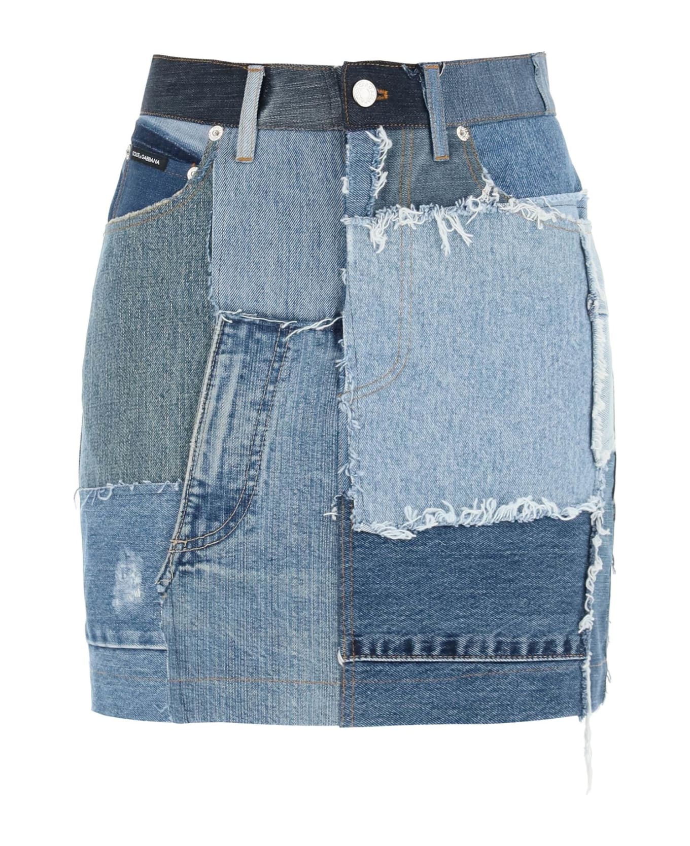 Dolce & Gabbana mini skirt in patchwork denim, finished with distressed details and contrast stitching. This unlined five-pocket style features a zip fly with button fastening on the front, belt loops, a logo label on the front pocket and a metal logo plate on the back pocket. Prints and finishing may vary, each item is unique. The model is 177 cm tall and wears a size IT 40.