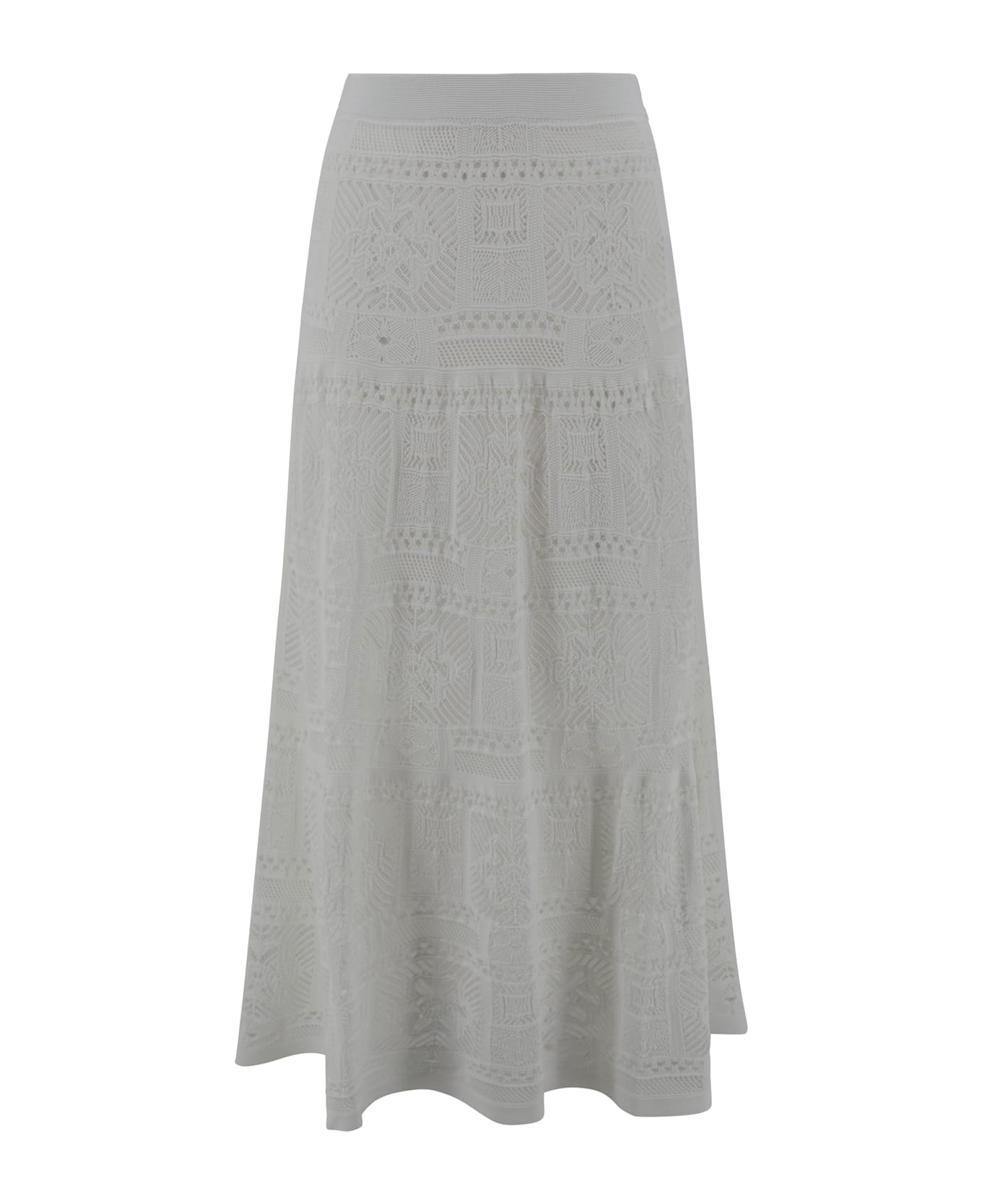 Patchowork high-waisted long skirt with embroidery and flared end hem.