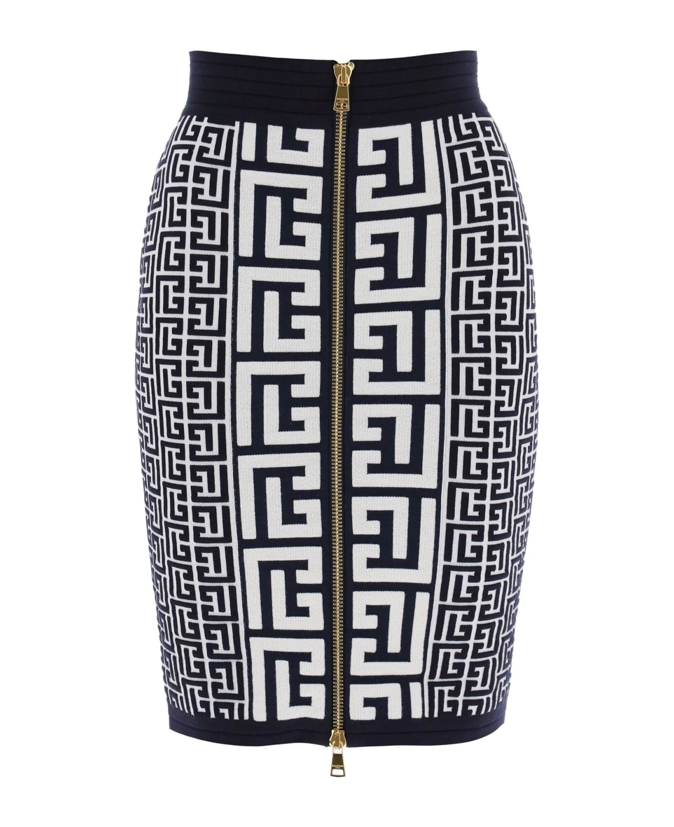 Balmain pencil skirt crafted in wool blend knit with monogram motif all-over. Design characterized by gold-tone metal two-way maxi zipper closure at front featuring elasticated waistband, Fitted with midi length. The model is 177 cm tall and wears size FR 36.