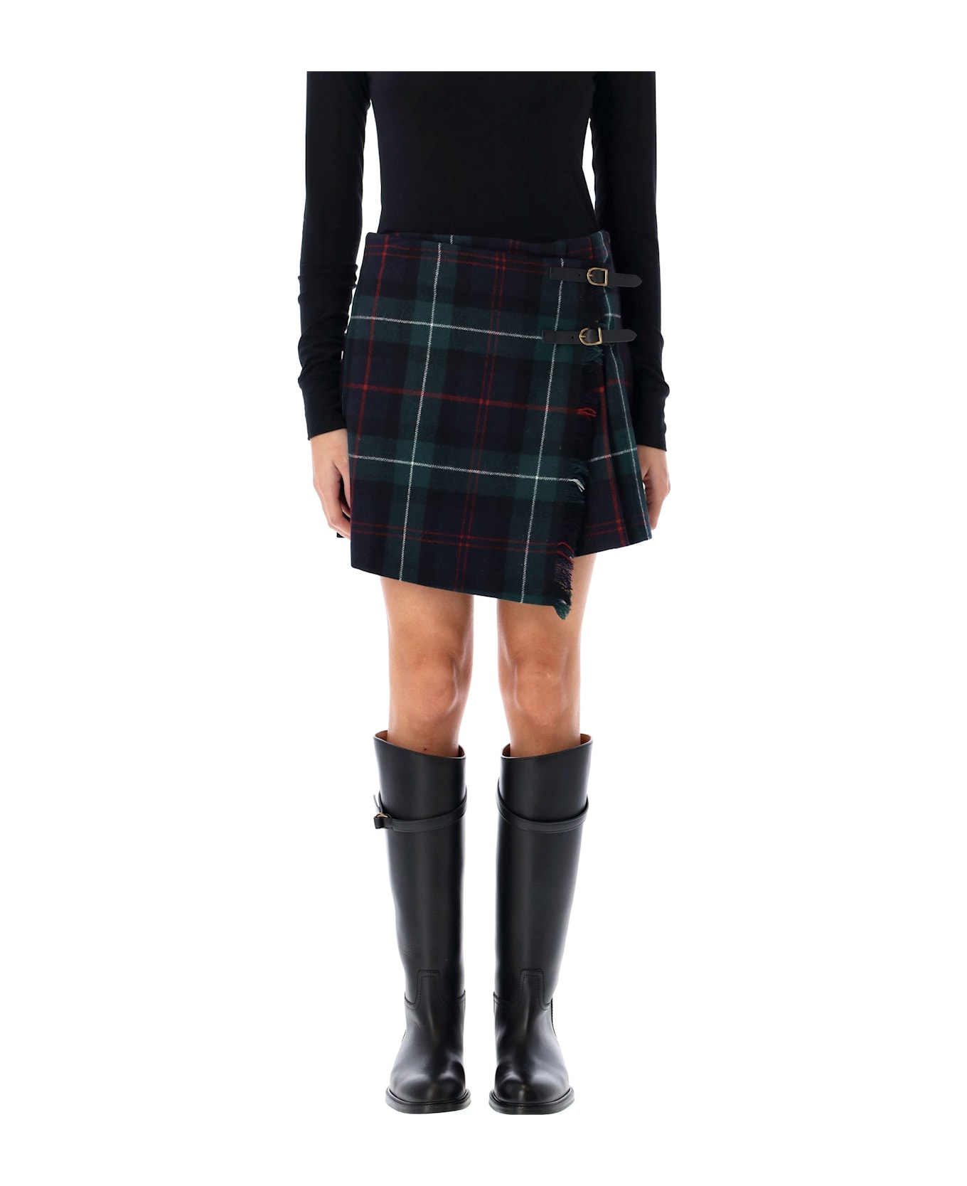 Wool Plaid Pleated Wrap Skirt By Polo Ralph Lauren. Featuring: Two Leather Tabs With Buckled Closure On The Left Waist Two Interior Buttoned Closures Wrap Silhouette Sunburst Pleating On The Back Panel Asymmetrical Hem With Frayed Trim On The Front Panel Unlined Model Is 1,70 M And Wears Size 4