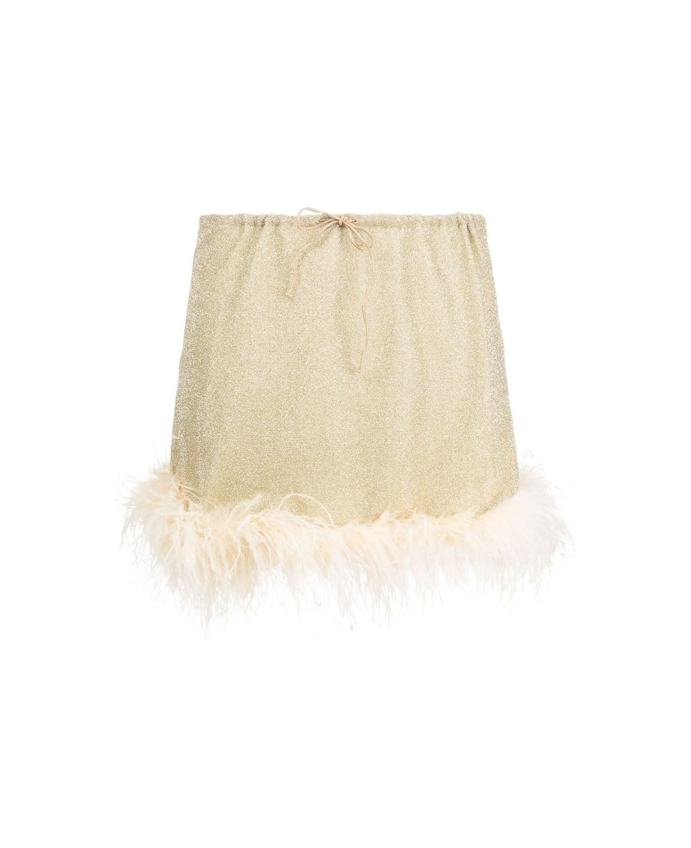 Lumiere Plumage mini skirt by Oseree made of platinum lurex with an elasticated waist and tonal ostrich feathers applied to the bottom hem.