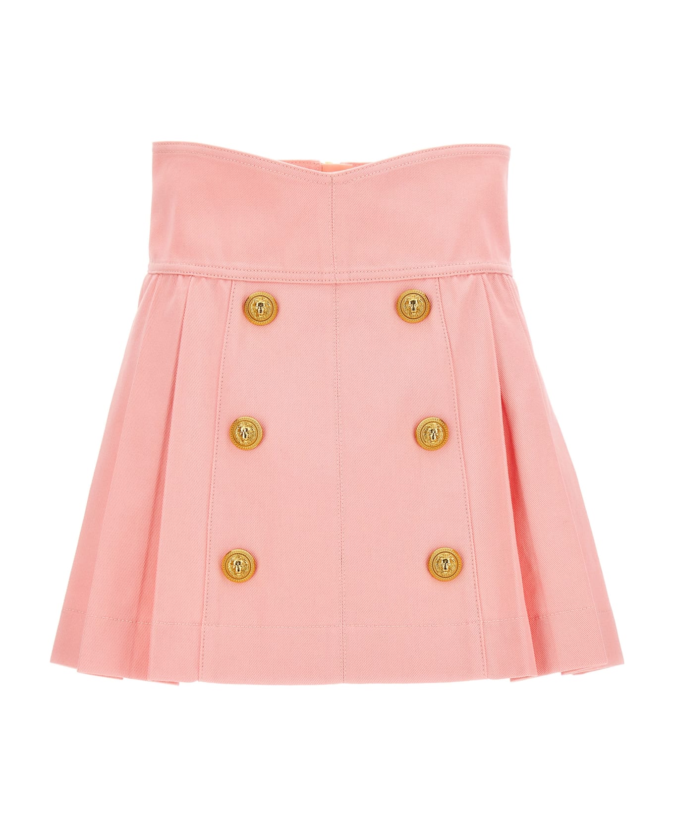 Pleated denim skirt with high waist and gold logo buttons at the front. Composition: 100% cotton