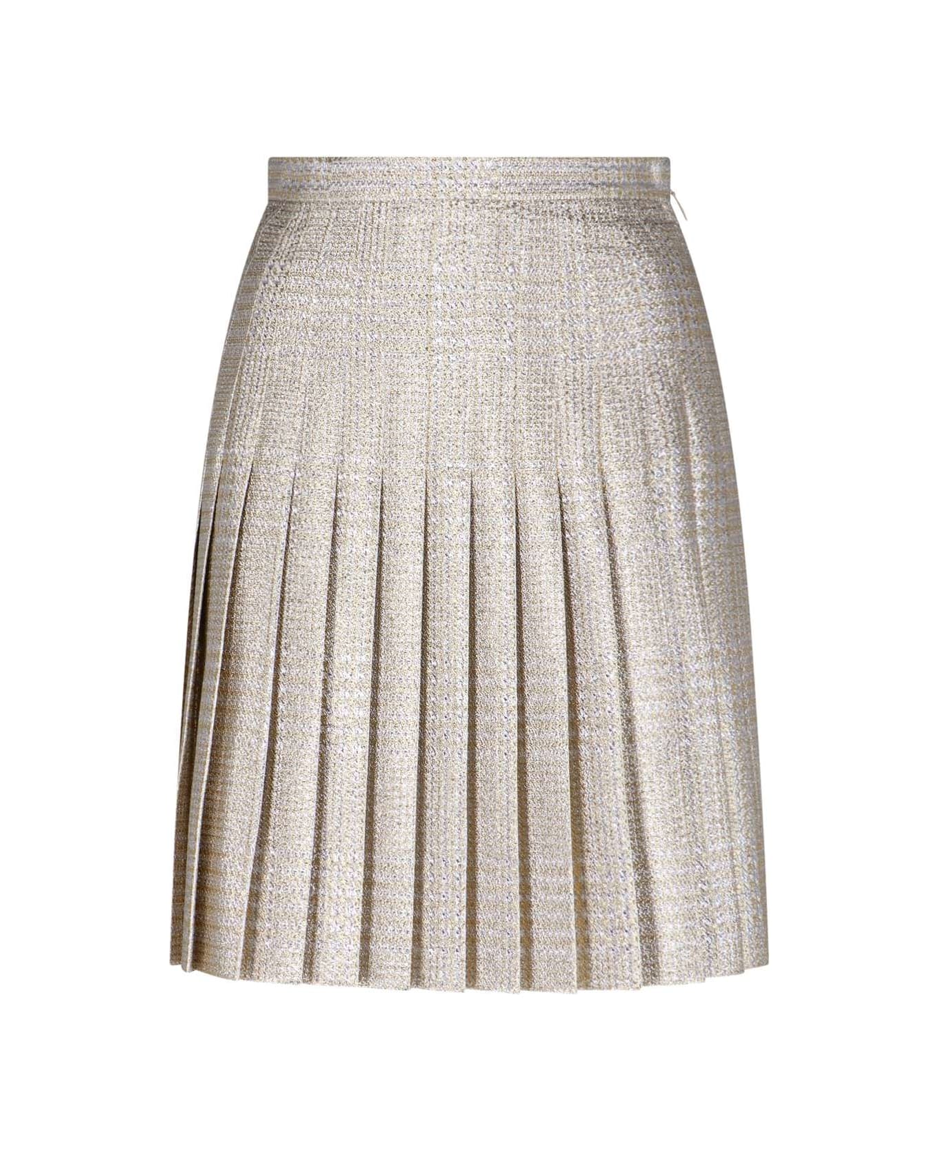 Celine pleated midi skirt in gold silk blend with metallic trim, pleated design, high waist, side zip closure, flared hem. Composition: 57% Polyester Metallic, 43% Silk