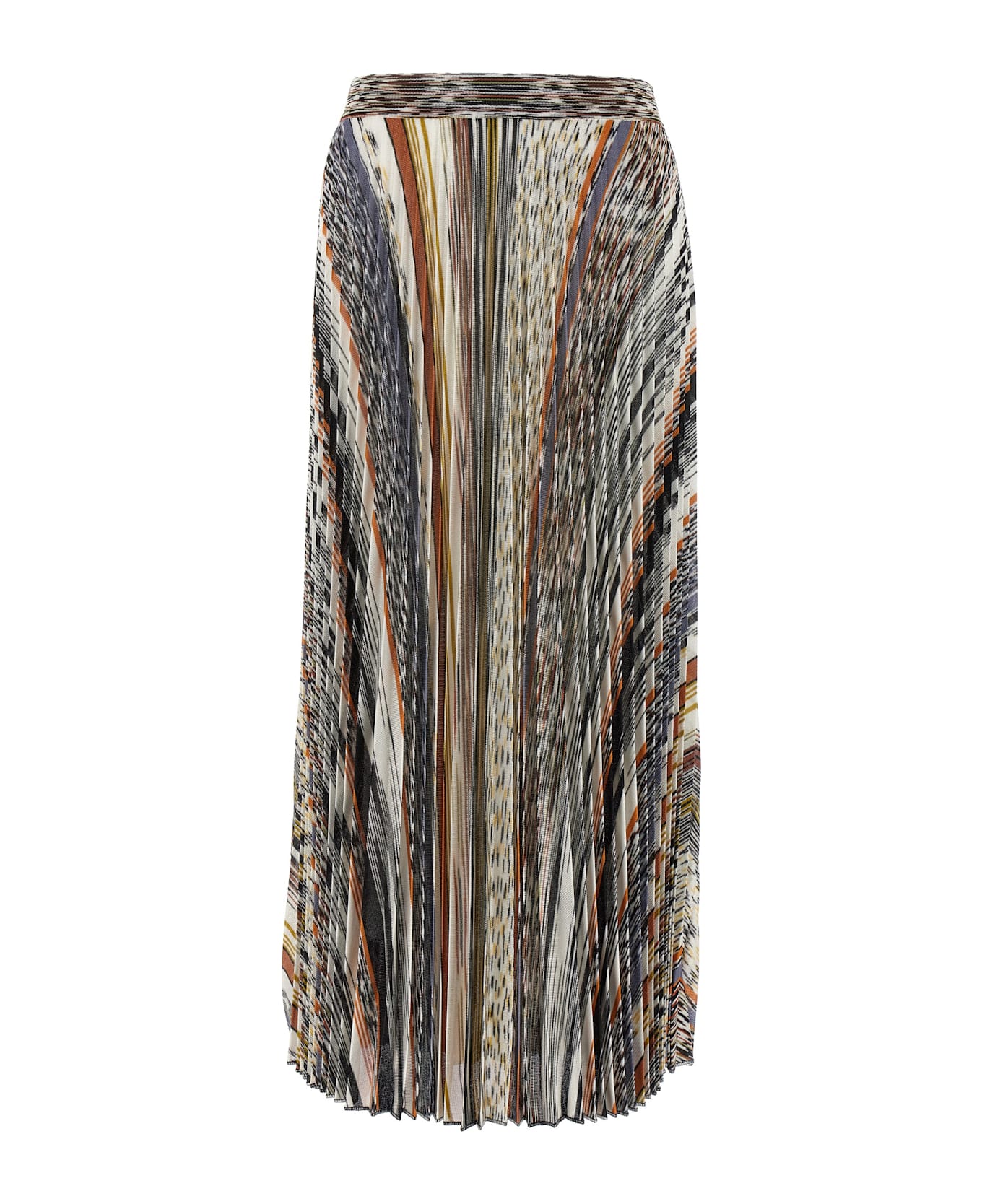 Pleated knit midi skirt, striped knit, elastic waistband.