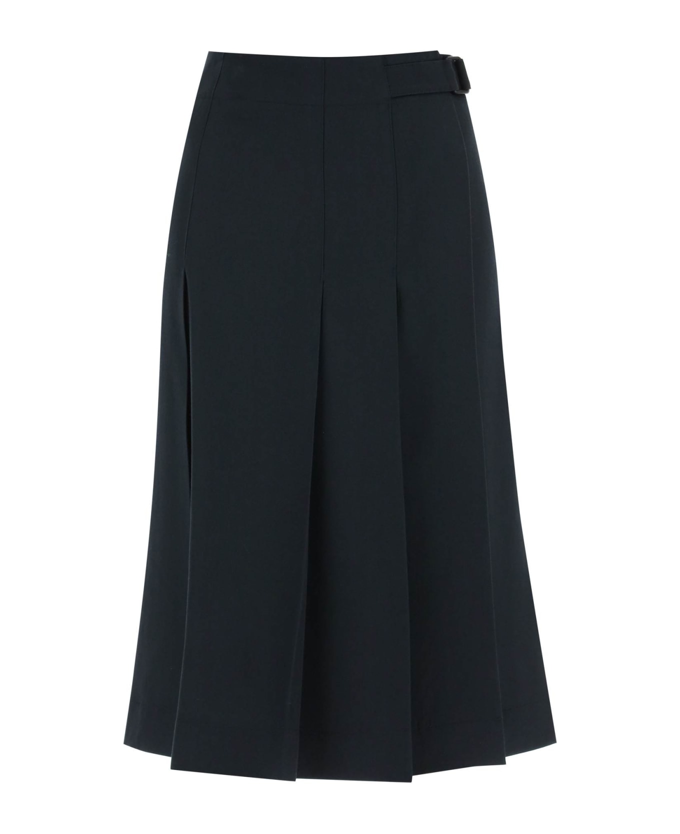 Pleated skirt by LEMAIRE crafted in virgin wool twill. It features a wrap design with strap and buckle closure at waist. Flared cut with calf length. The model is 177 cm tall and wears size FR 34.