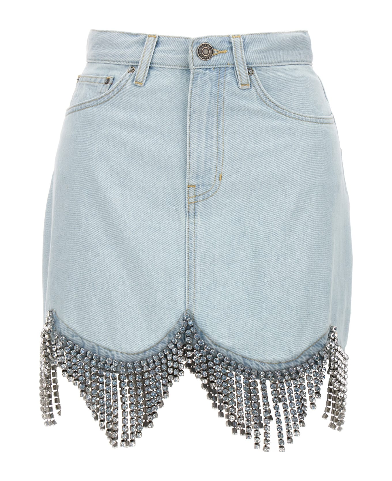 Scalloped Denim Crystal' cotton denim skirt with dismembered hem with crystal fringed application, zip and button closure, pockets.