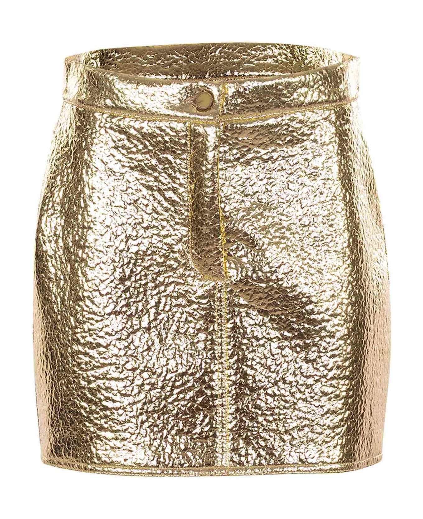 Skirt Alysi in faux leather Gold. Front closure with button and zip. Back pockets. Craklè effect fabric. Regular Fit. 100% polyester Made in Italy