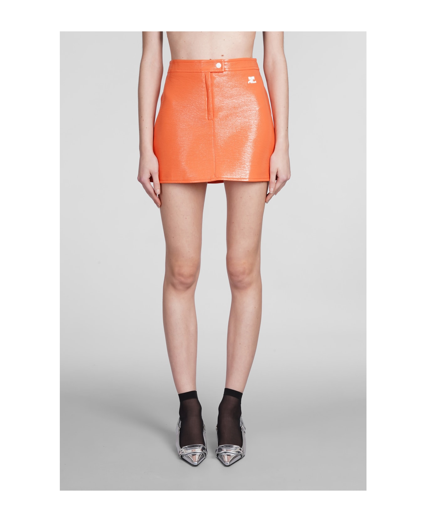 Skirt in orange polyester, flap closure, side patch logo, straight hem, vinyl effect, 88% Cotton, 10% polyurethane, 2% elastan, made in Serbia, Model is 180 cm and wears 36