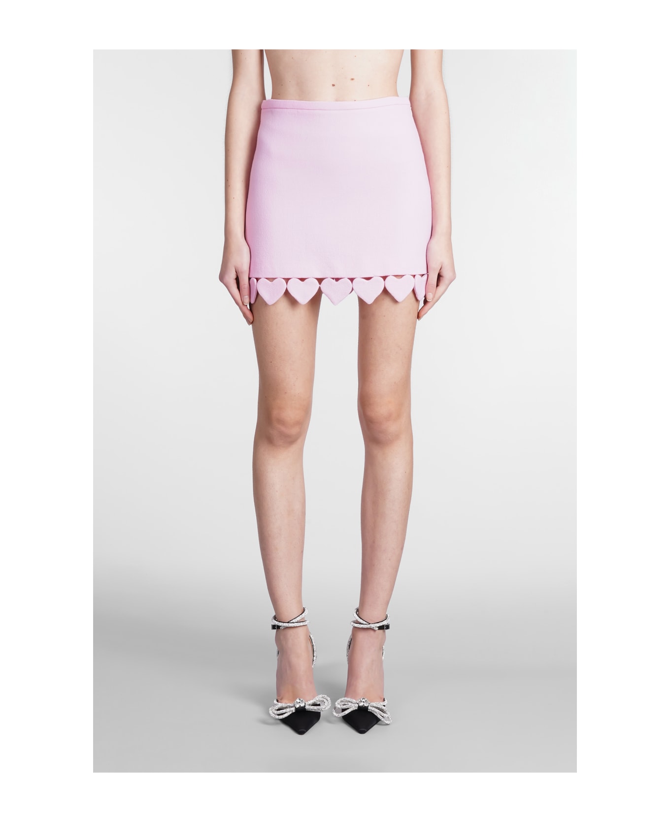 Skirt in rose-pink wool, high waist, zip clousure, heart embroidery, cristal details, 100% cotton, Made in Italy, Model is 180 cm and wears size 34