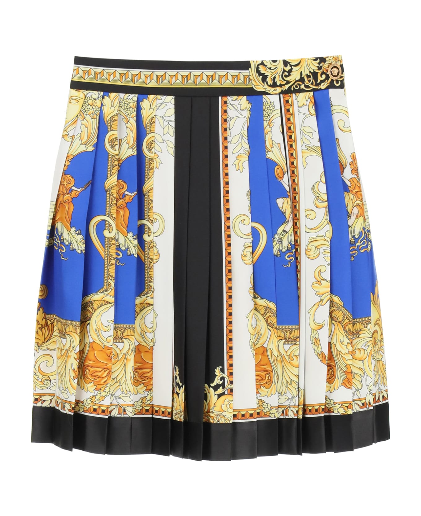 Versace pleated mini skirt in pure silk twill with all-over "Barocco" print. High-waisted line with side slit and a solid color band on the hem. Side closure with concealed zip and golden button with iconic Medusa. Unlined. The model is 177 cm tall and wears a size IT 38. Composition: 100% seta
