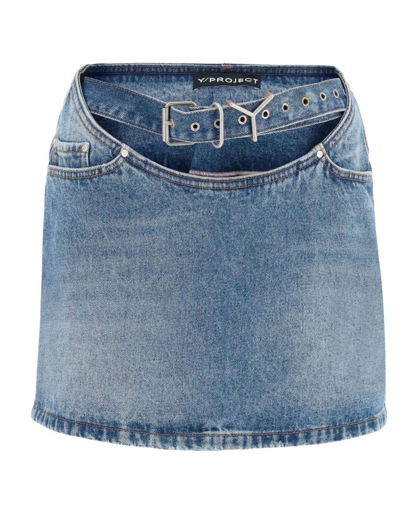 Y/Project denim mini skirt featuring a five-pocket construction enriched by an arc-shaped waistline and an adjustable Y belt. The model is 177 cm tall and wears a size 26.