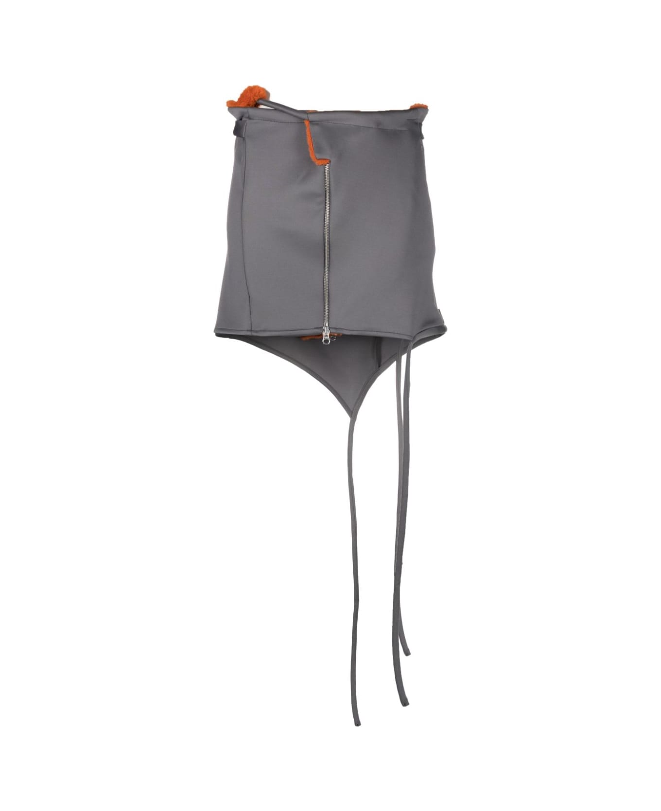 asymmetric-hem zip-up miniskirt from OTTOLINGER featuring slate grey, pumpkin orange, stretch-jersey, deconstructed design, faux-fur trim, belted waist tabs, off-centre front fastening, front zip fastening, side zip-fastening pocket and asymmetric edge.