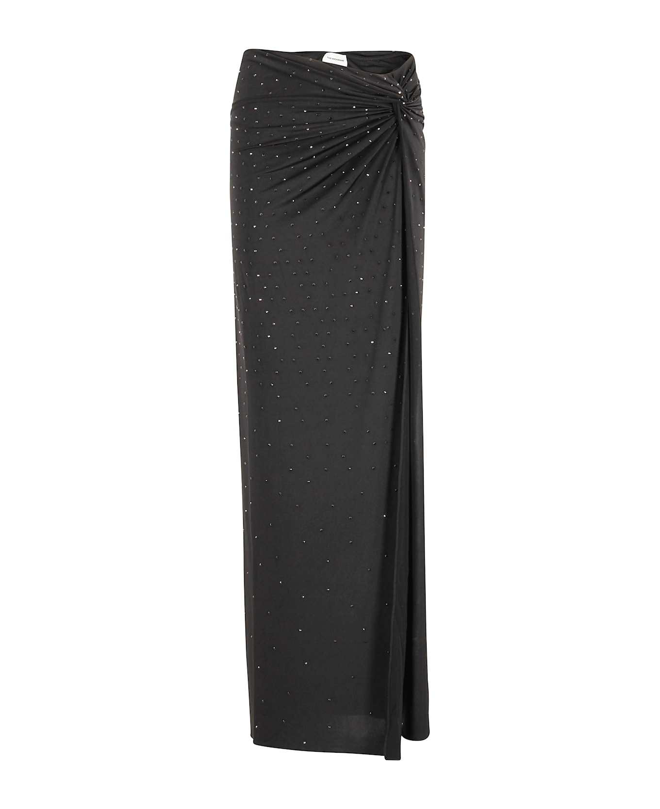 Skirt - The Andamane - Zohra model - Black color - Applied tone-on-tone rhinestones - Draping at the side - Side slit - Elastic waistband