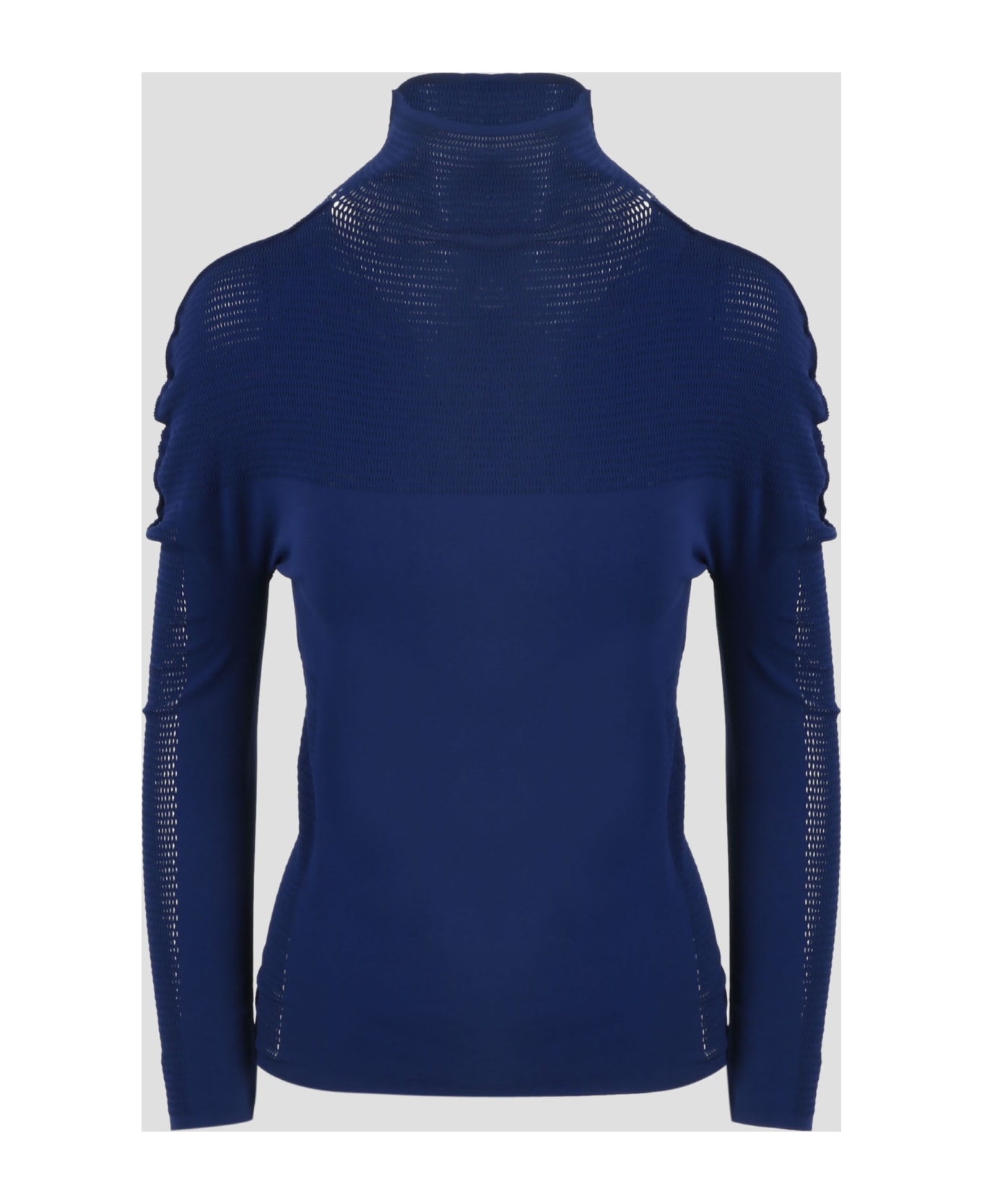 Pleats Please by Issey Miyake top, in stretch nylon. - FW22 - Slim fit - High neck - Mesh on the yoke, sides and sleeves - Draped effect on the shoulders - Made in Japan - 94% Nylon 6% Polyurethane