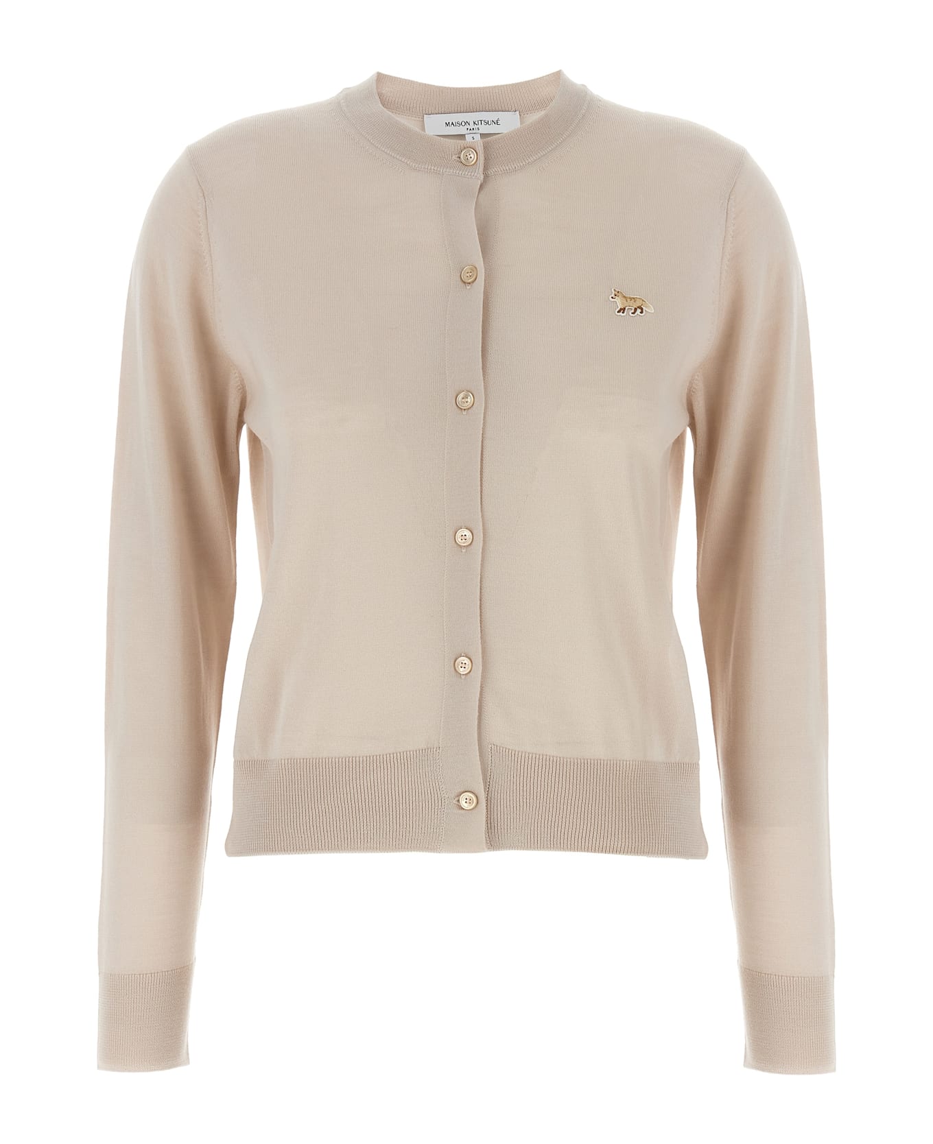 Fine merino wool cardigan, front 'Baby Fox' patch, crew neck, front button closure, long cuffed sleeves.