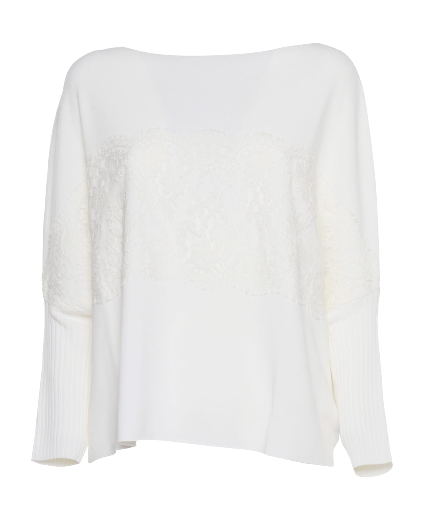 Viscose blend sweater, wide neckline, lace detail, maxi ribbed edge