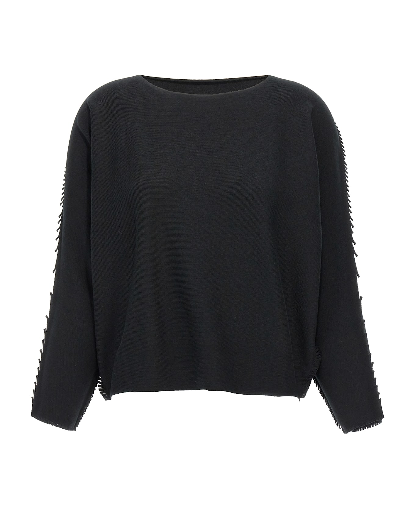'Campagne' cotton blend sweater with boat neck, long sleeves, fringed trimming.