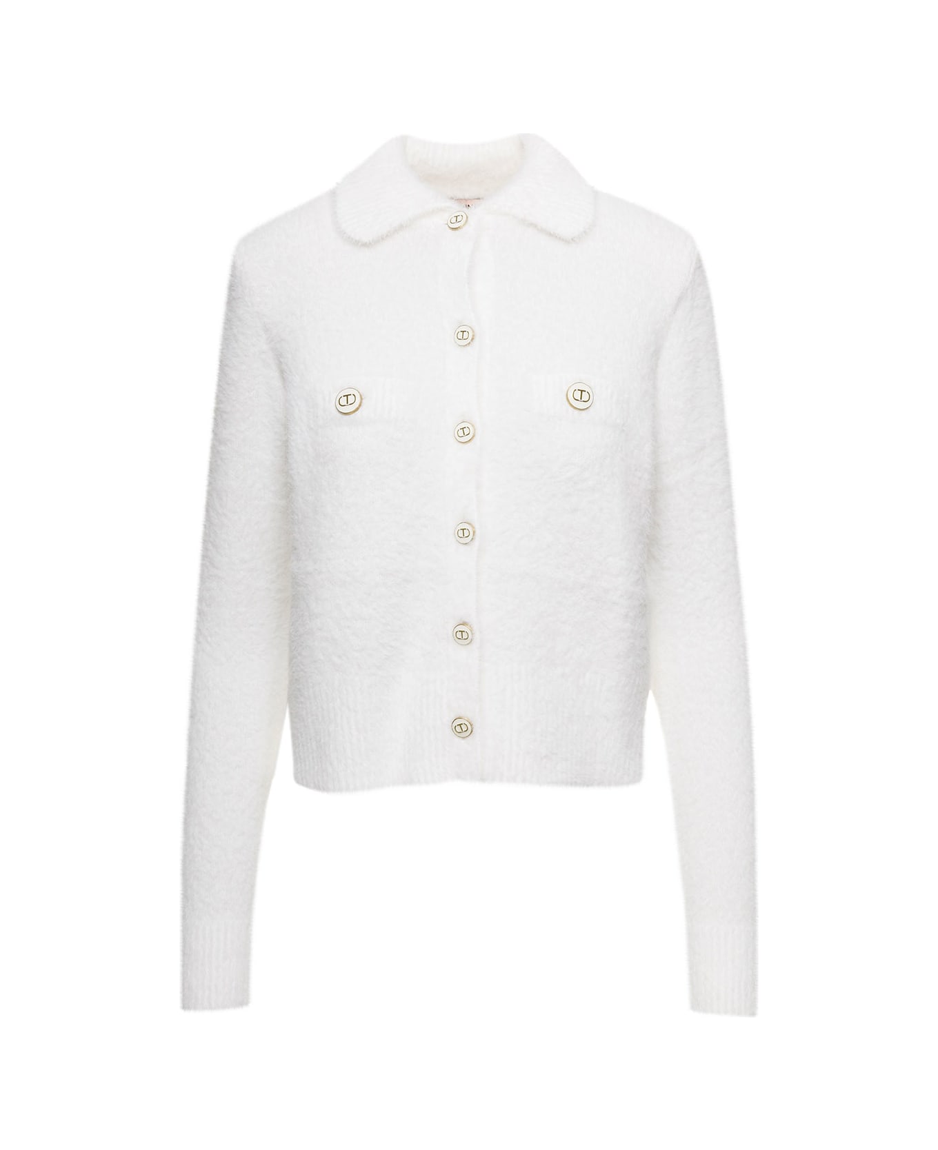 Cardigan Classic collar Long sleeves Front button fastening Branded buttons Ribbed trim White Brushed polyamide Regular fit