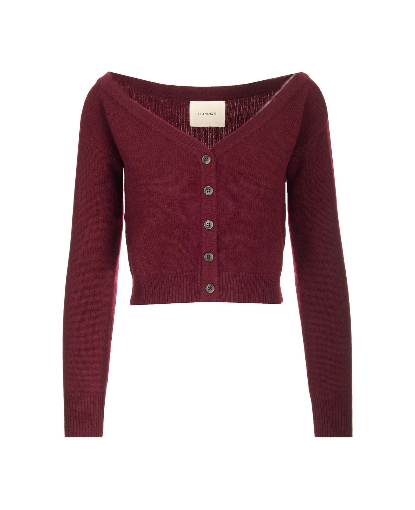"Beata" cashmere knit cropped cardigan with off-the-shoulder design by Lisa Yang.