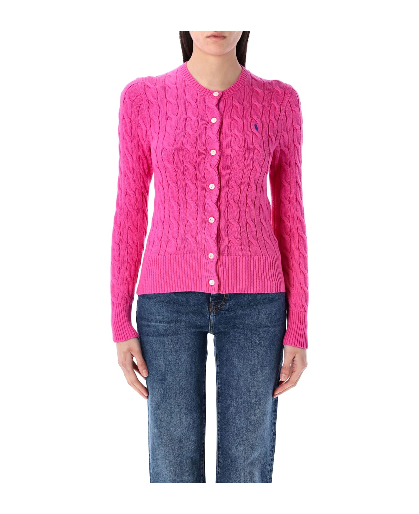 Cotton Cable-knit Cardigan By Polo Ralph Lauren. Featuring: Slim Fit Slightly Cropped Crewneck Buttoned Placket With Woven Grosgrain Trim Long Sleeves Ribbed Edges Signature Embroidered Pony On The Left Chest Model Is 1,72 M And Wears Size S
