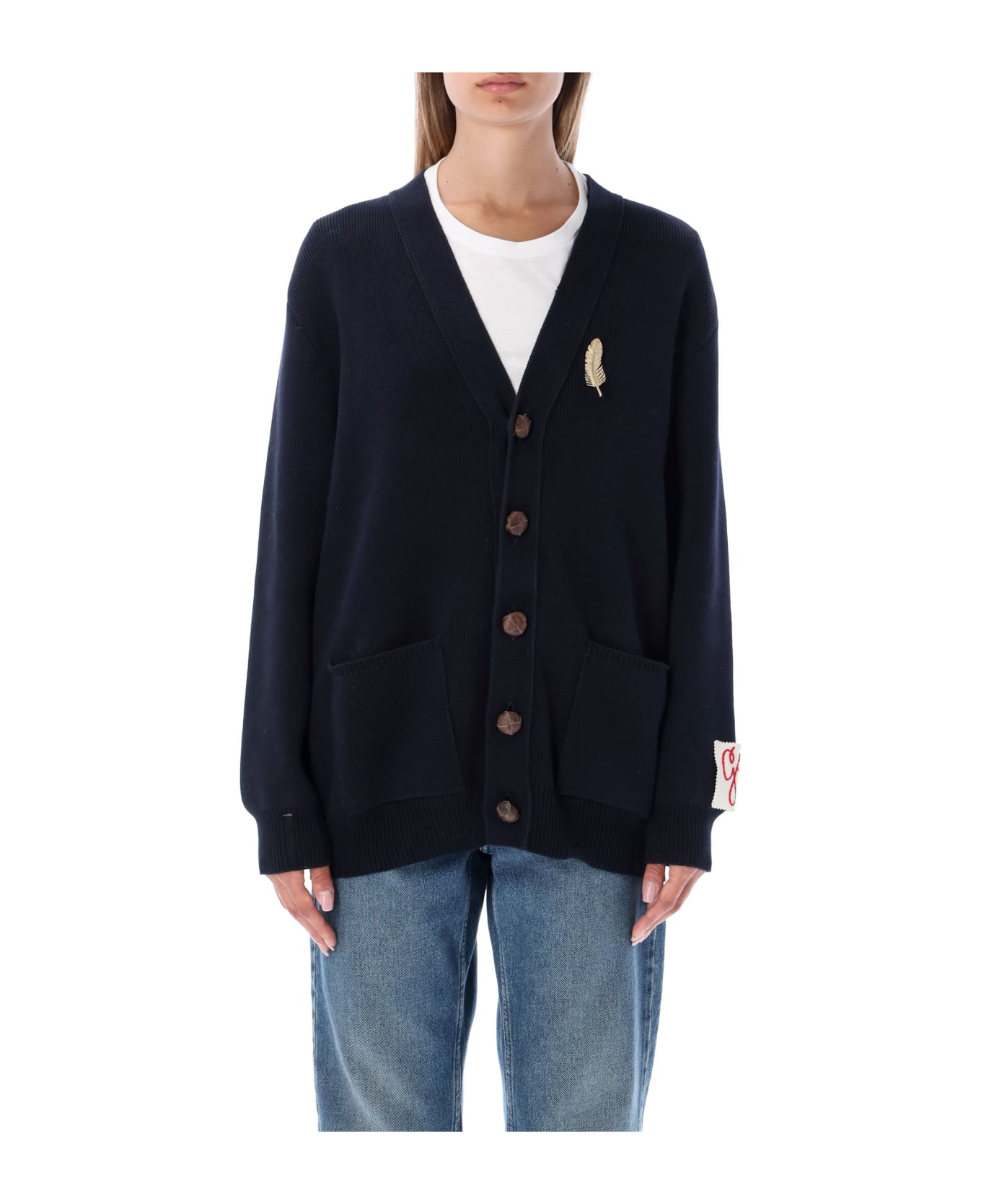 Dark Blue Cotton Cardigan Daniella Basic By Golden Goose. Featuring: V-neck Front Button Fastening Long Sleeves Detachable White Patch With Embroidered Red Letter G Gold-tone Pin Detail At Front Front Patch Pockets Distressed Details Double Gold Star On The Back Straight Hem
