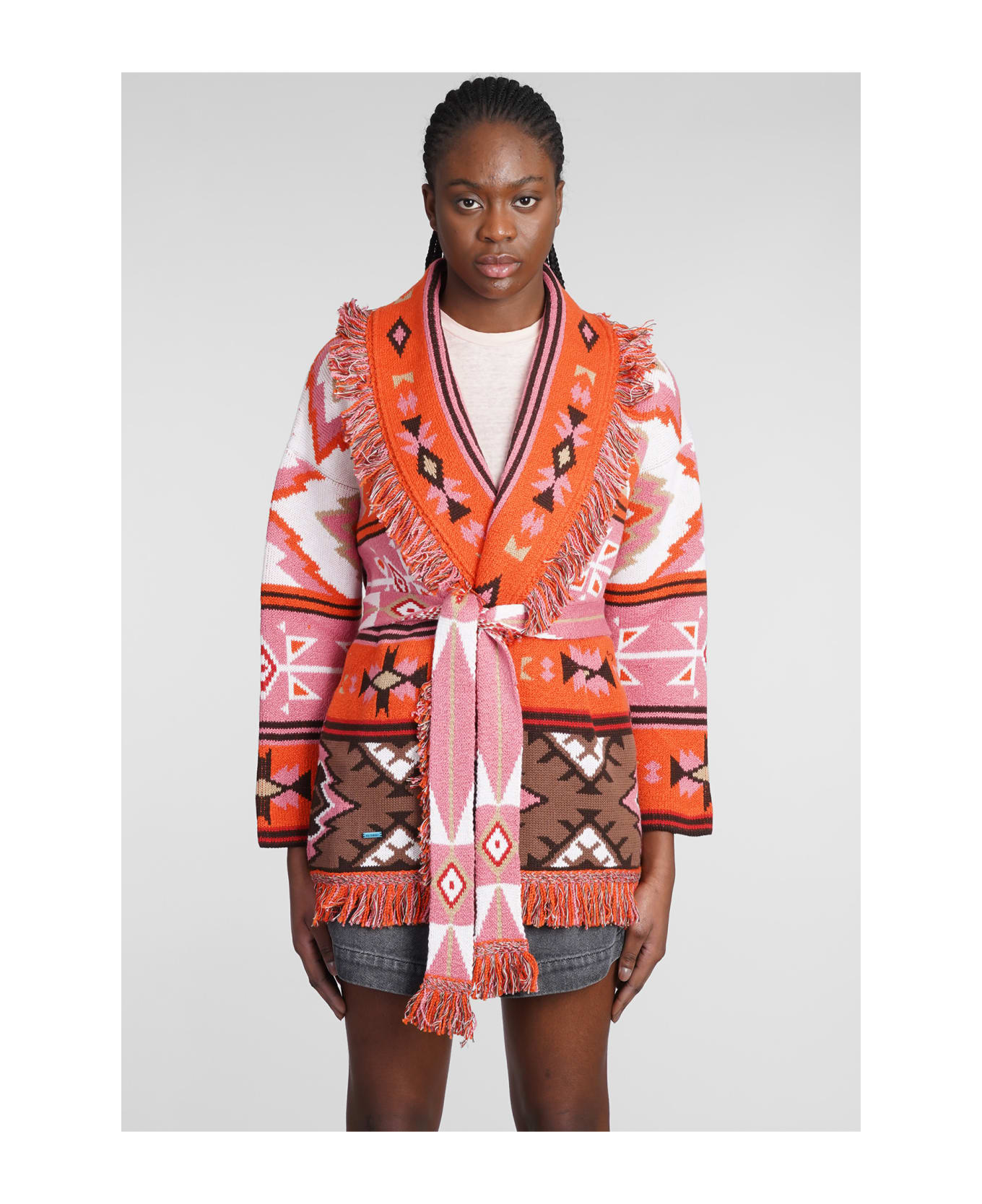 Cardigan in Viola wool, revers, hem with fringe, belt waist, long sleeves, pockets, jacquard print, Made in Italy, Model is 180 cm and wears size XS, 100% wool