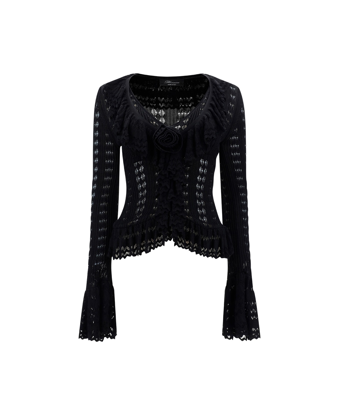 Cardigan by blumarine, single button front closure embellished with three-dimensional floral detail, wide ruffle appliqué at cuffs, asymmetrical fringed hem with ruffle, v-neck on front, cut-out weave design, slim fit.