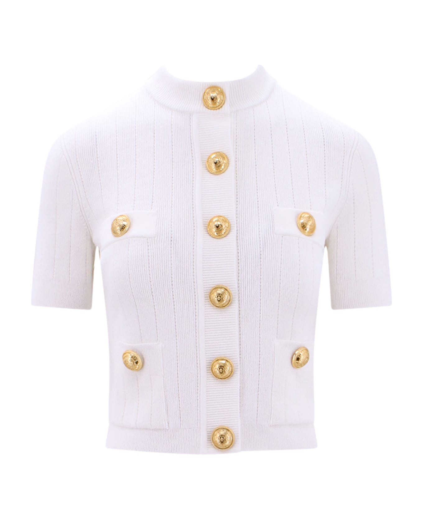 Viscose blen cardigan with iconic buttons - Closure With Snap Buttons - Short Sleeve - Trompe-l'oeil Frontal Pockets - Made In Italy - 83% Viscose 17% Polyester