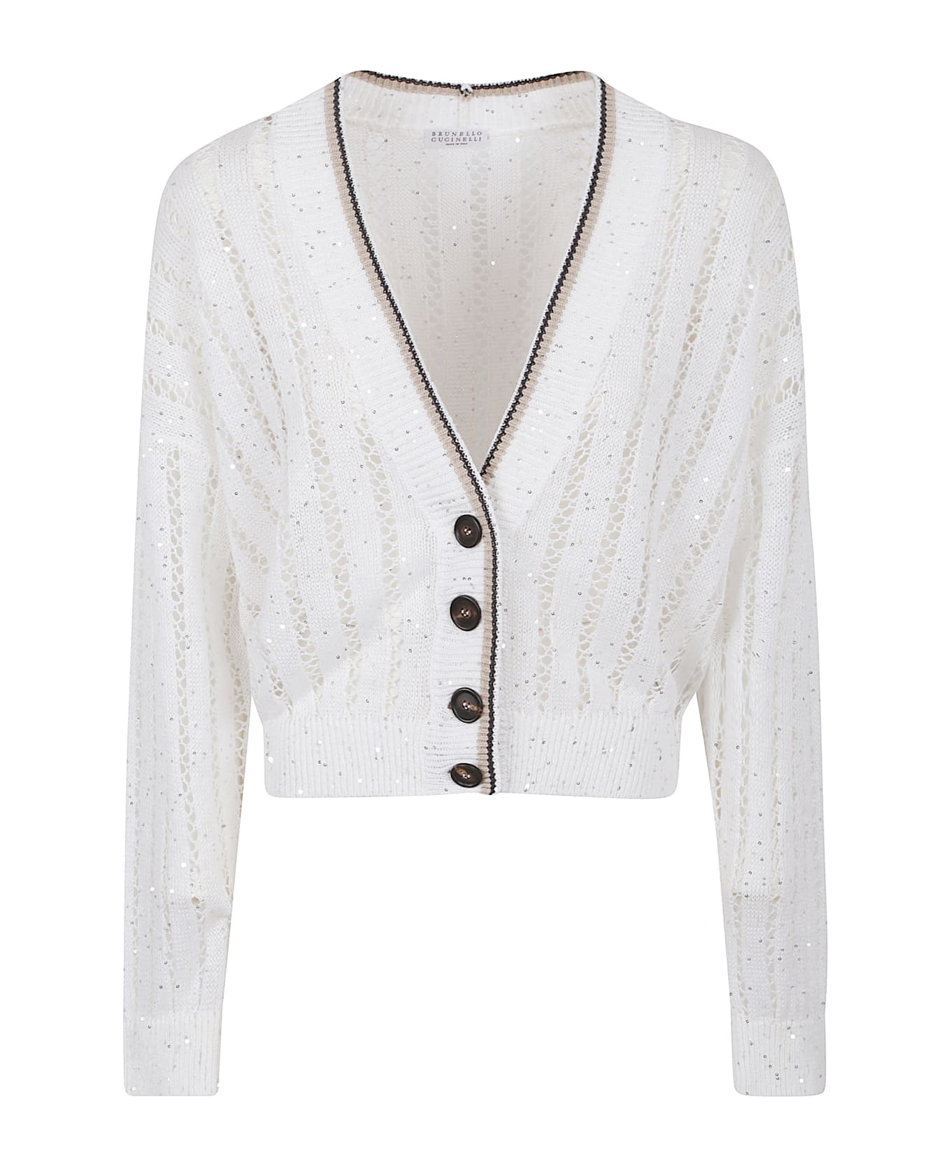 Dazzling knitted sweater by BRUNELLO CUCINELLI. V-neck; wide sleeve; low shoulder; horn button closure. Features a ribbed technique with very wide stitches, a net effect emphasized by small sequins.