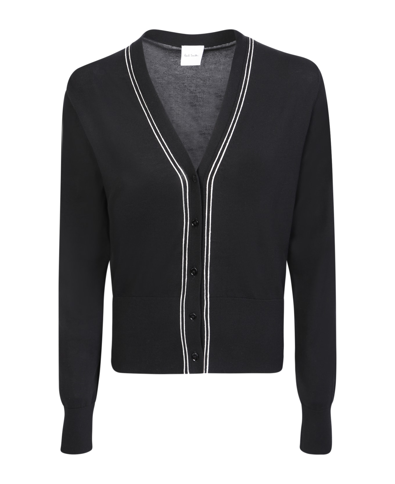 V-neck. Long sleeves. Knitted construction. Contrasting trim. Front button fastening. Straight hem. Color: black