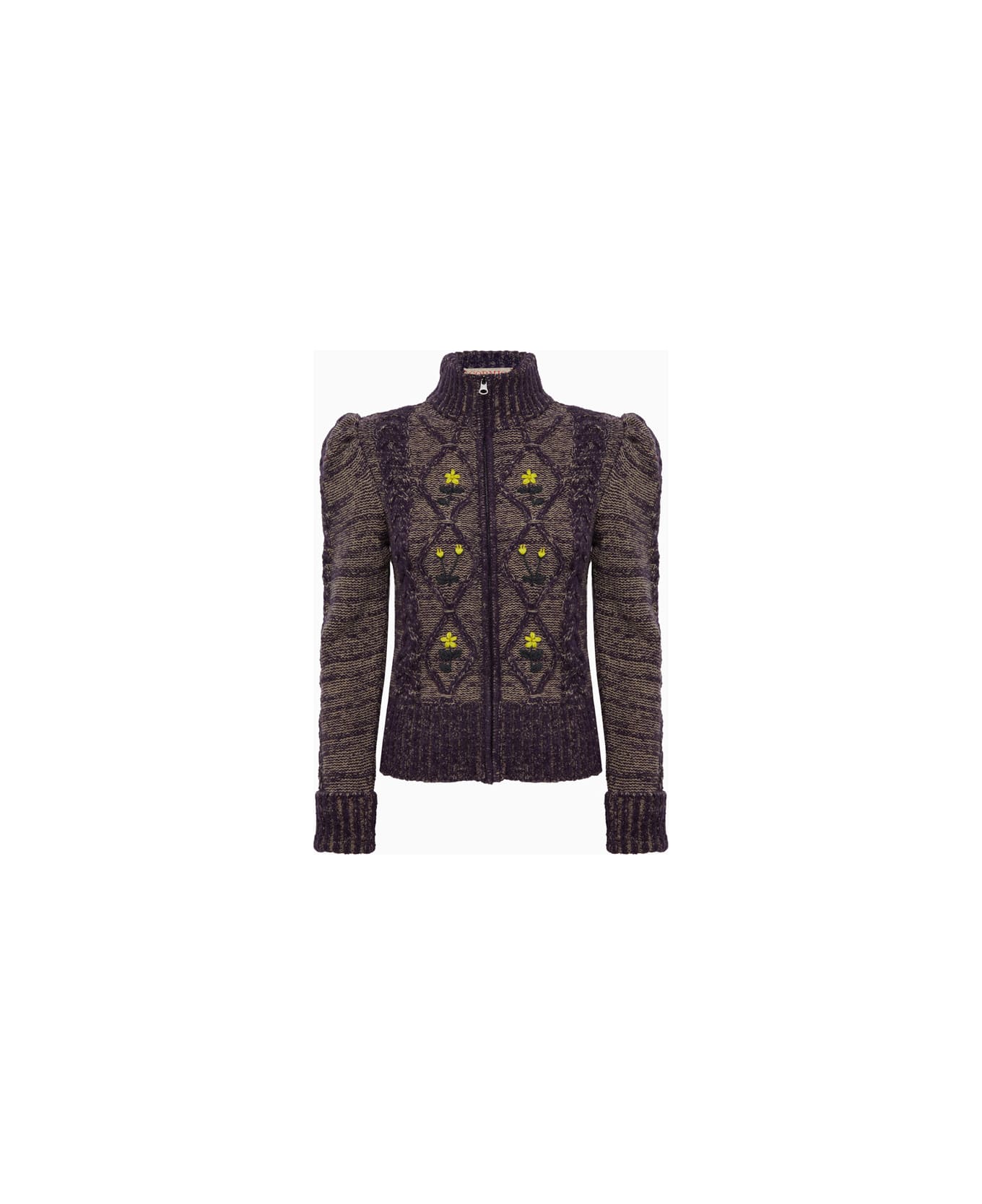 made in italy emma cardigan with a pattern recalling tyrolean aesthetics. made of two-color interwoven yarn wool. floral embroidery at front. full-length zipper on front. long puffy sleeves, turn up cuffs. regular fit. composition: 1005 wool.