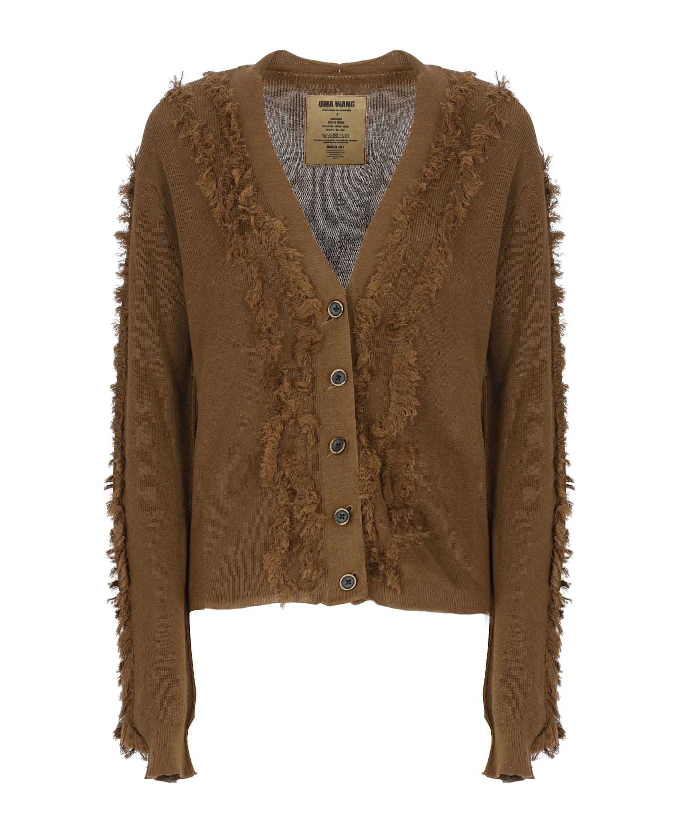 - Brown Uma Wang cotton cardigan for woman - V-neck - Long sleeves - Front buttons fastening - All-over fringes details