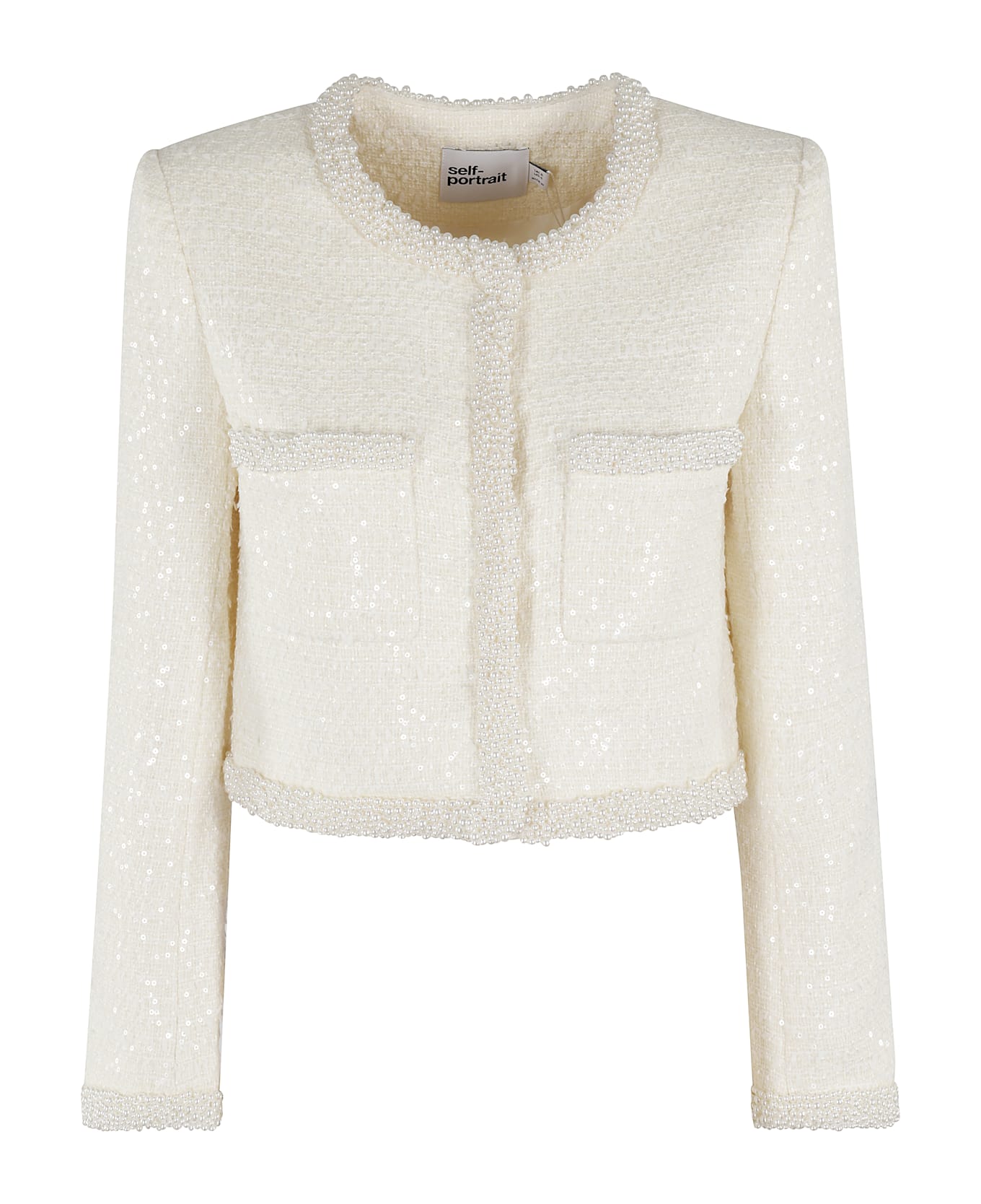 Jacket - Self-Portrait - Cream color - Bouclé - Long sleeves - Round neckline - Tonal beaded appliques - All over sequins - Crop pattern - Two front pockets - Front snap button closure