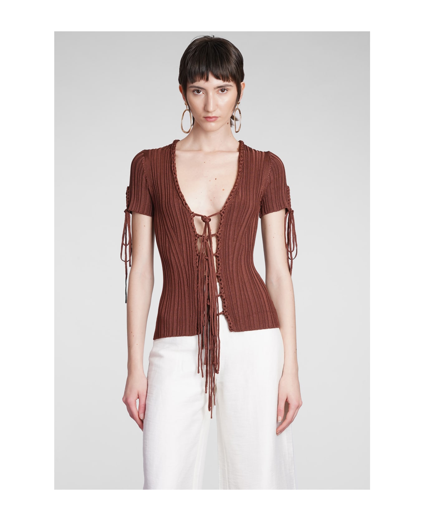 Daisy Topwear in brown viscose, lace up, short sleeves, kint design, 100% Viscose, Made in Prc, Model is 180 cm and wear a size S