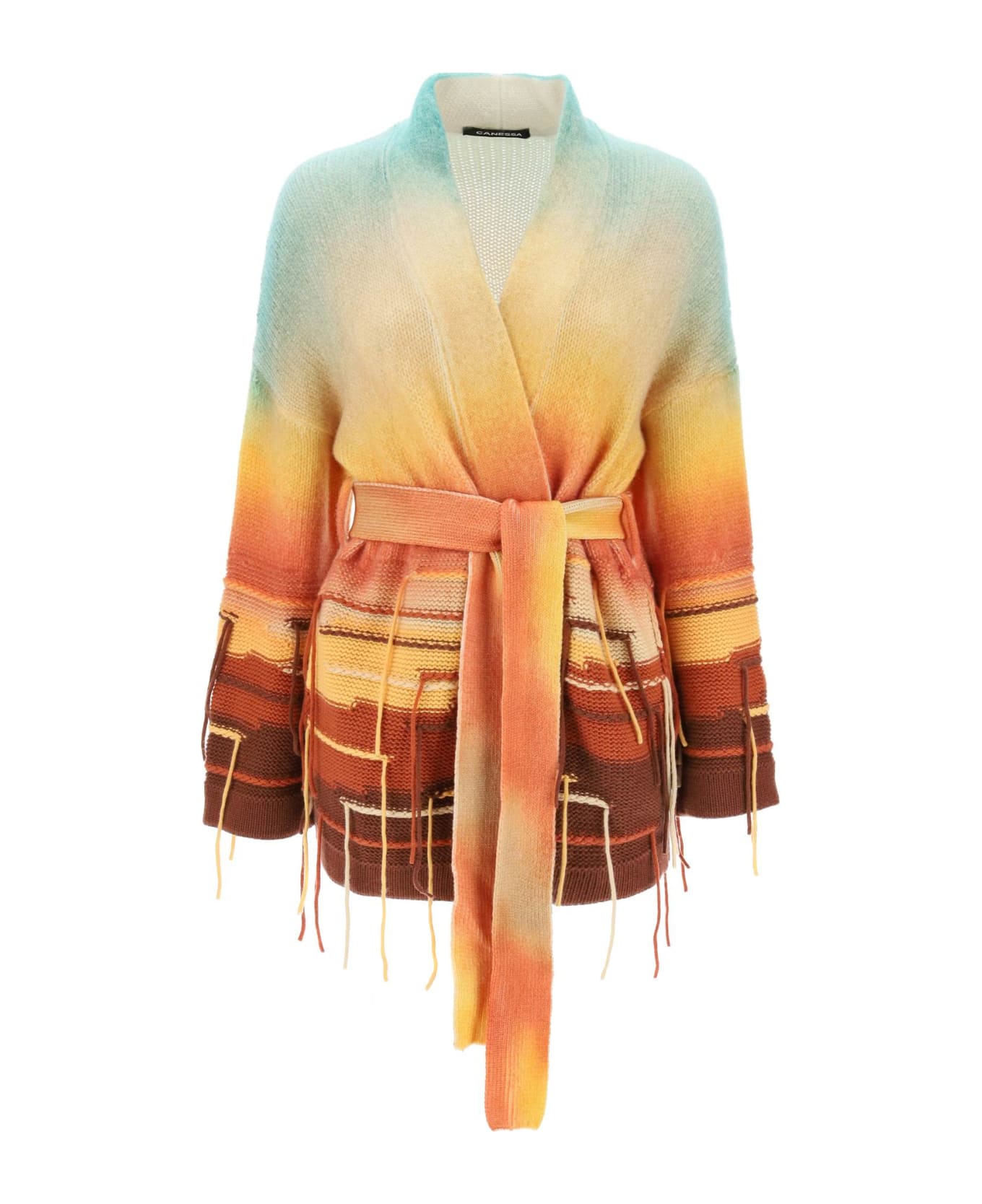 Oversized cardigan in pure multicolor cashmere, enriched by a gradient print on the finished garment, a fringed intarsia motif on the back and embroidered details with hanging threads. Wrap design with matching self-tie belt, side inseam pockets and ribbed trims. The model is 177 cm tall and wears a size 1.