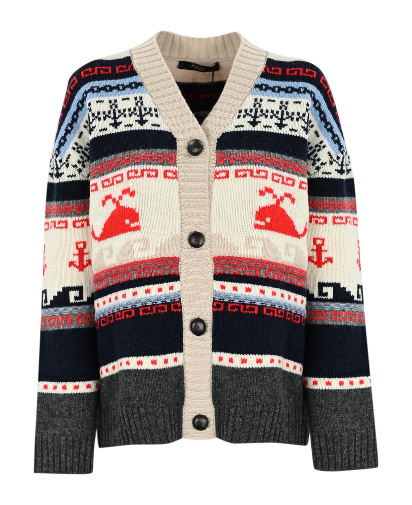 women's cardigan: long sleeves v-neck button closure ribbed edges pattern with drawing regular fit composition: 70% virgin wool, 30% polyamide
