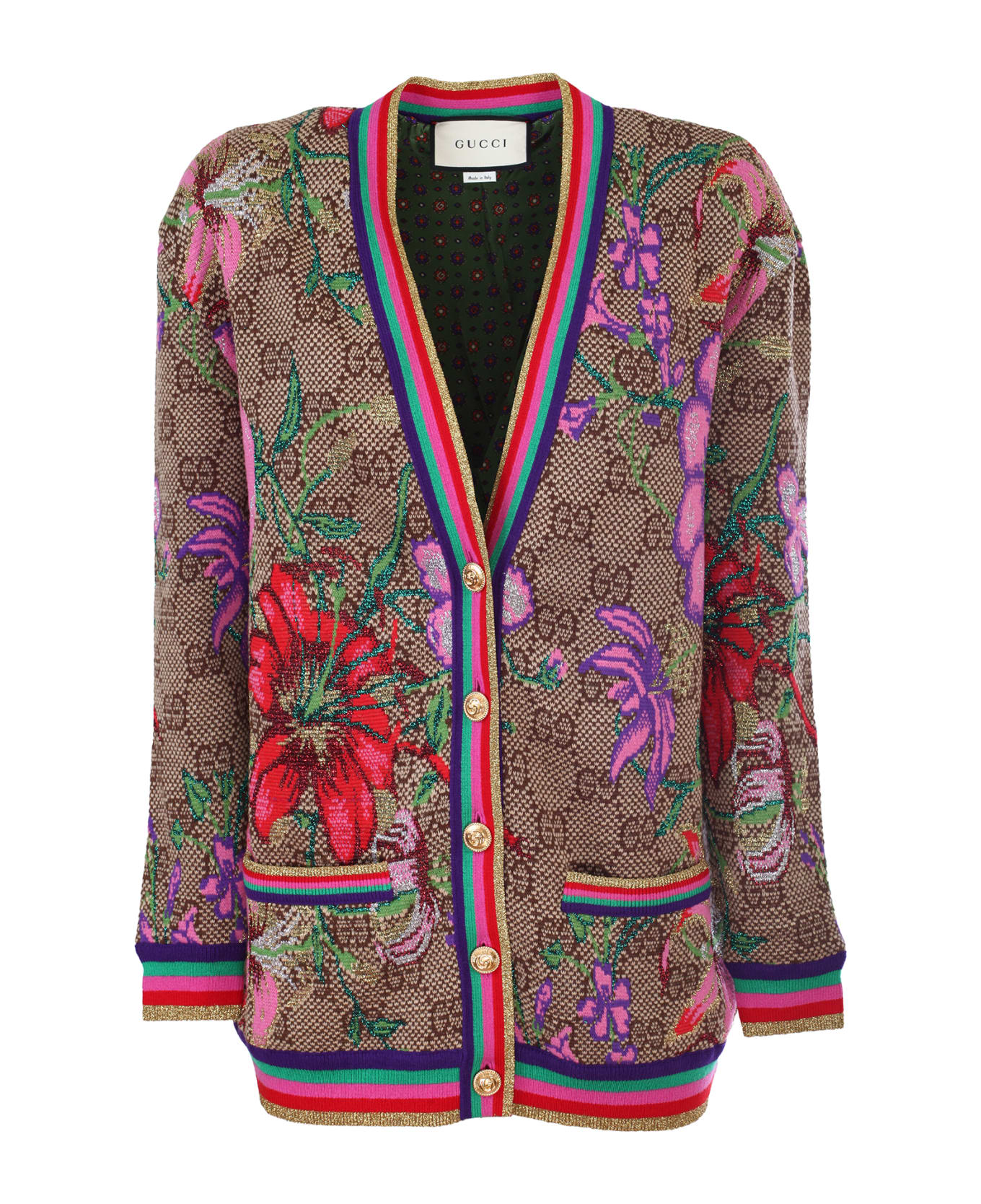 Gucci jacquard wool cardigan with Flora motif and GG pattern. Multicolour striped finishes with gold lamé. Gold colored metal GG buttons. Lining with print. Front pockets. 100% wool. Made in Italy.