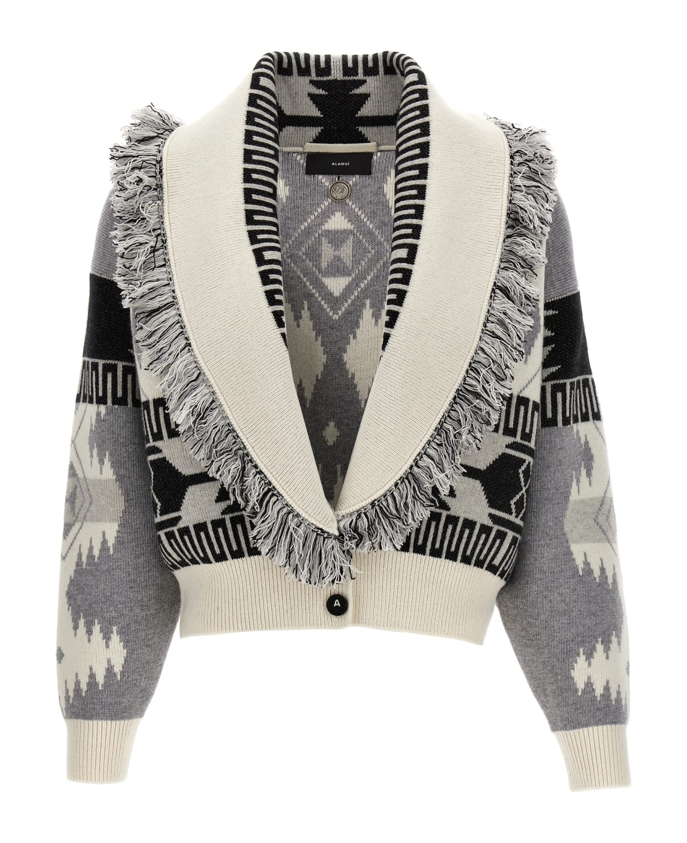 'Icon' cashmere cardigan with all-over jacquard pattern, fringed detail at the edges, button closure, pockets, long sleeves. Composition: 70% virgin wool 30% cashmere