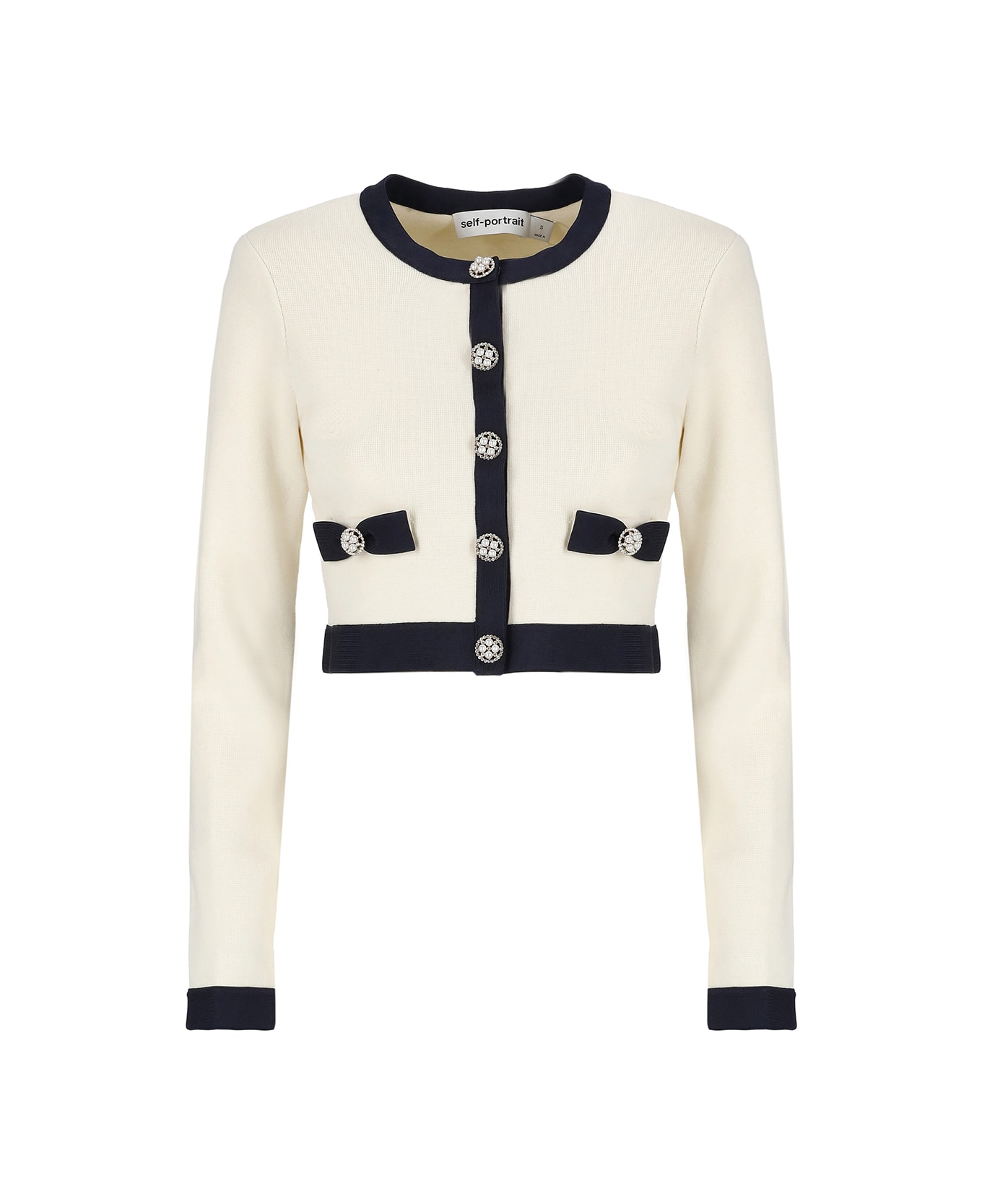 - Ivory Self Portrait cotton and wool blend cropped cardigan for woman - Crew neck - Front snap buttons fastening with jewel details - Long sleeves - Contrasting color trims - Two front pockets with contrasting color bow and jewel