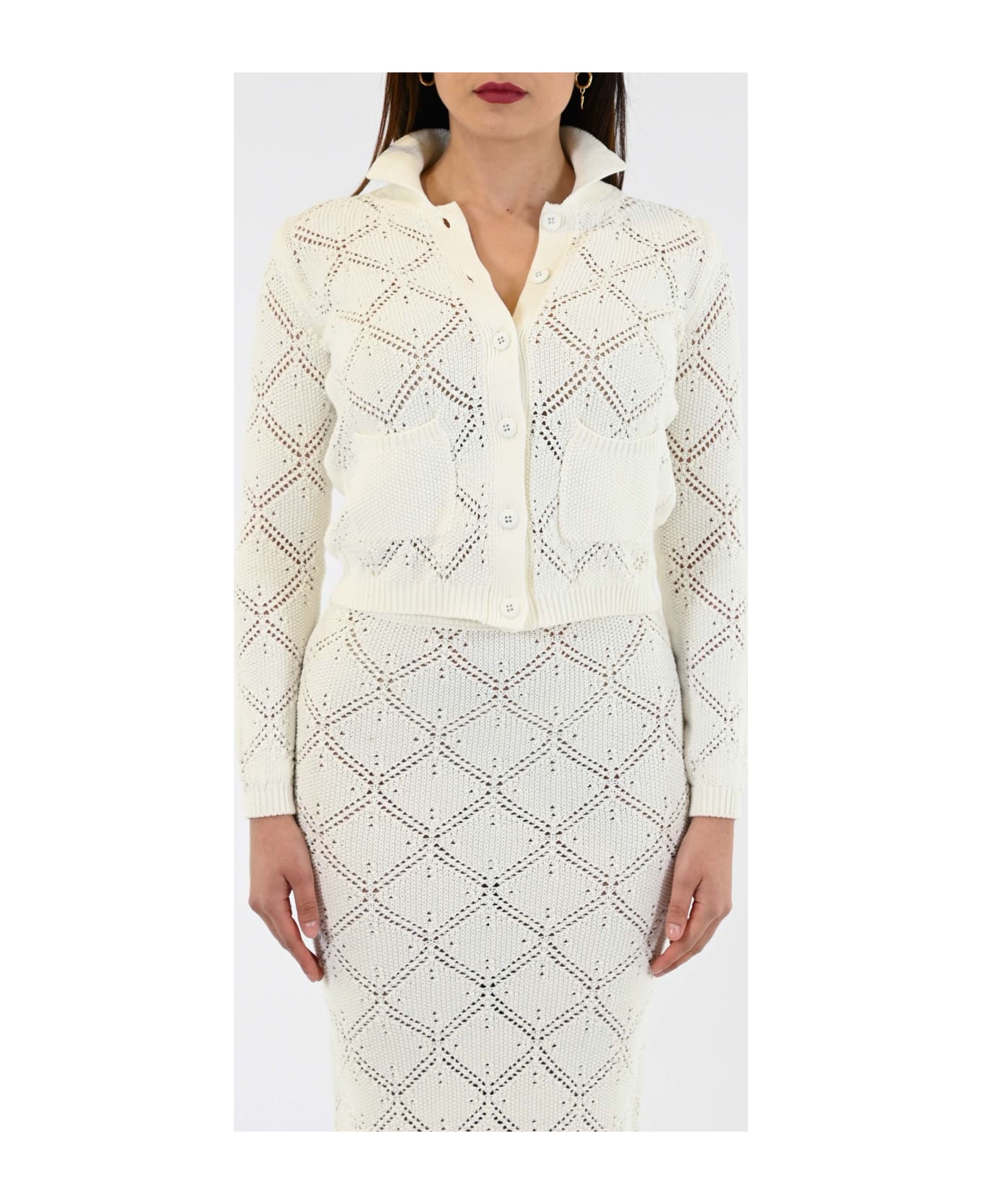 straight fit cardigan in cotton knit with diamond pattern, closed with buttons. shirt collar and long sleeves. patch pockets and ribbed trims. 92% cotton, 8% polyester. hand wash cold water; do not bleach; do not tumble dry; dry flat in the shade; lukewarm iron max 110 degrees c; delicate dry cleaning with perchlorethylene; do not wet clean professional. ; use a cloth between the garment and the iron. ; use neutral detergent.