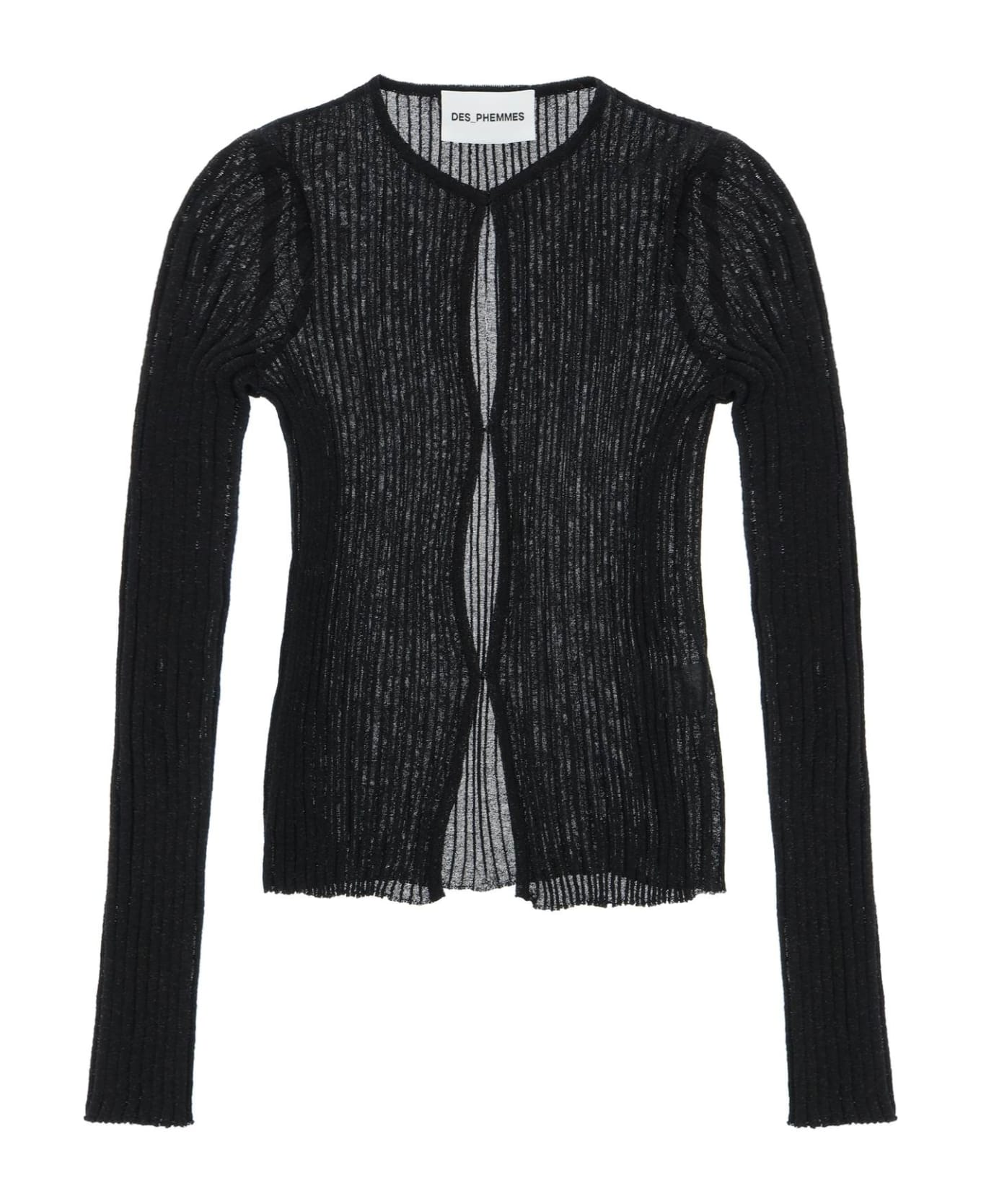 Des Phemmes long-sleeved ribbed-knit lurex cardigan with front hook closure. Tight fit. The model is 177 cm tall and wears size 40.