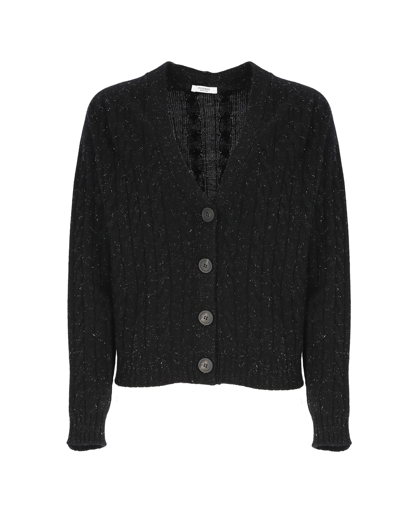 - Black Peserico wool cardigan for woman - V-neck - Front buttons fastening - All-over braided pattern Composition: 60% Virgin Wool, 17% Silk, 13% Viscose, 9% Cashmere, 1% Polyester