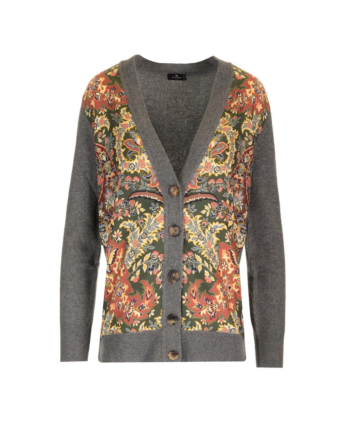 Paisley print cardigan in grey wool and cashmere blend knit from Etro, with a silk twill insert on the front decorated with a floral Paisley print.