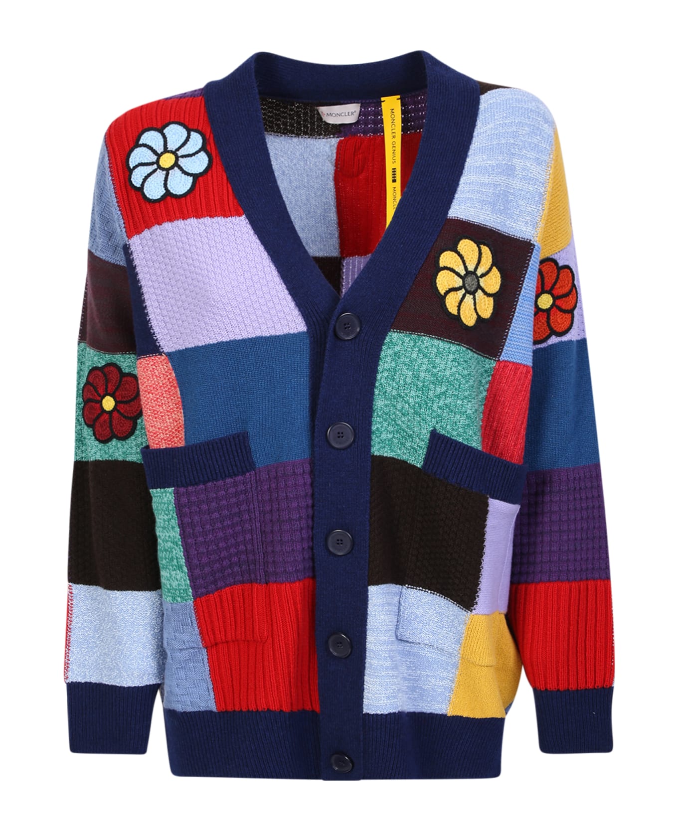 Crafted from a patchwork yarn. Multicolor inlay. Guage 7. Crochet flower patches. Button up. Knit patch pockets. Felt logo patch.