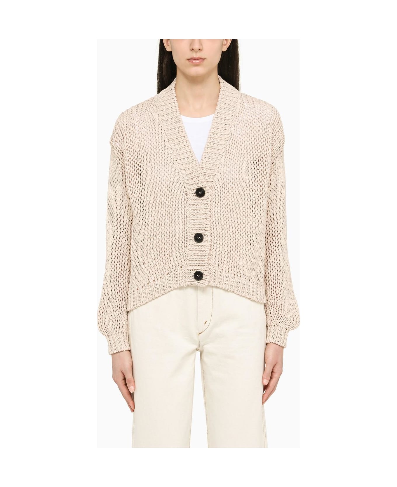 Powder-coloured cotton-blend short cardigan by Roberto Collina with long sleeves and features a front button fastening.