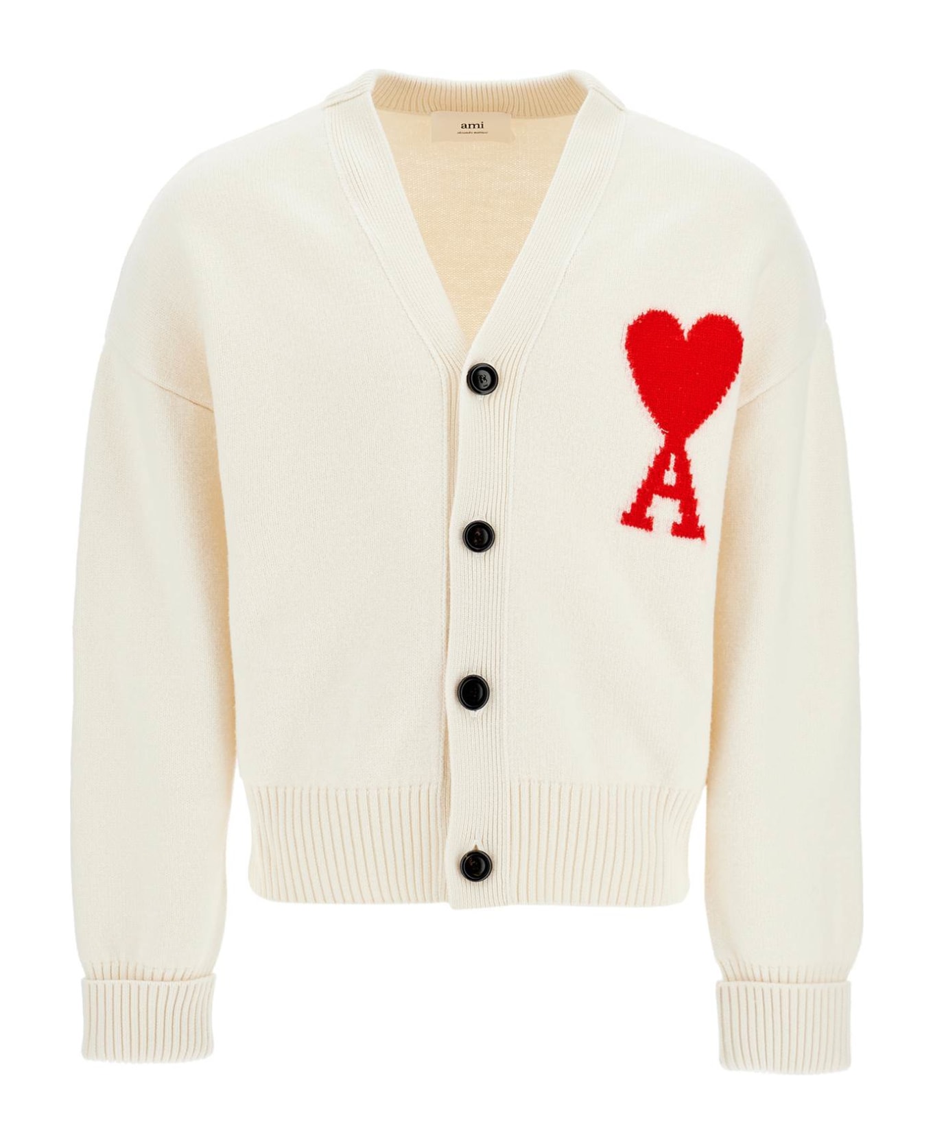 Ami Alexandre Mattiussi cardigan made of heavyweight virgin wool, finished with ribbed hems and decorated with a contrasting jacquard logo on the chest. Slightly cropped and relaxed fit. Composition: 100% WO