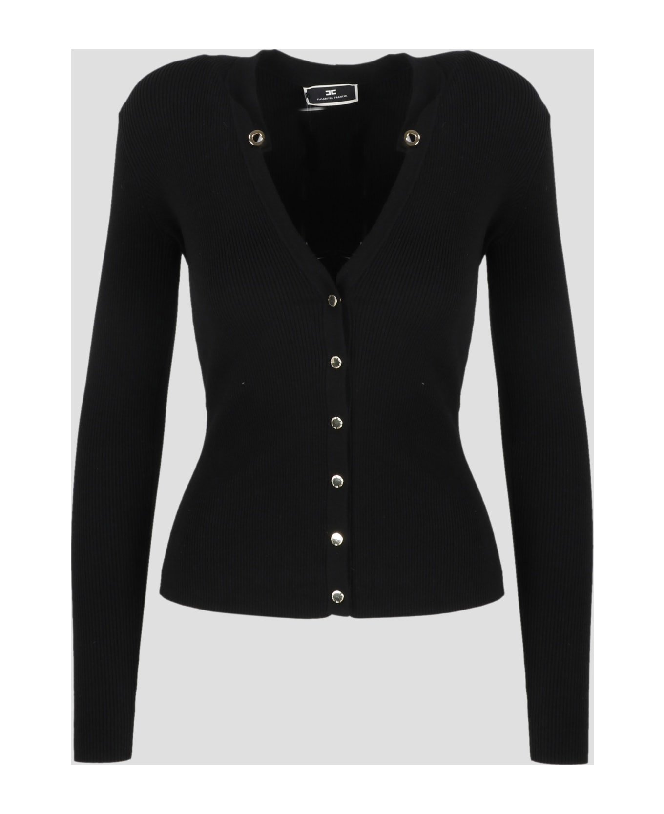 Elisabetta Franchi cardigan in ribbed knit with chains and tassels. - SS23 - Slim fit - V-neck - Automatic in gold metal - Made in China - 57%Lyocell, 27%Silk, 16%Polyamide