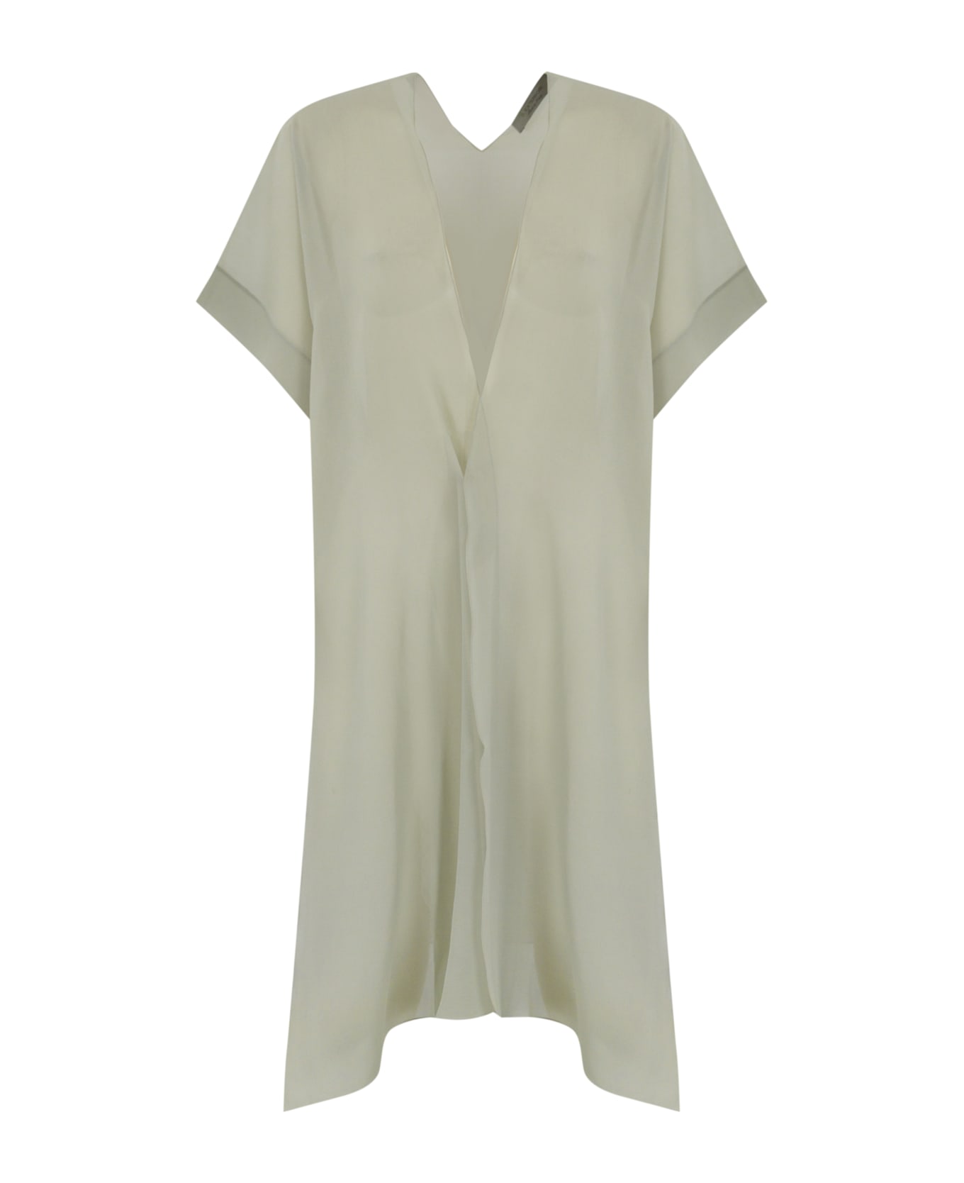 women's silk duster coat: silk georgette short sleeves sleeve bottom with turn-up v-neck on the back regular fit composition: 100% silk